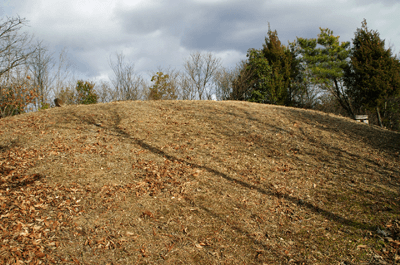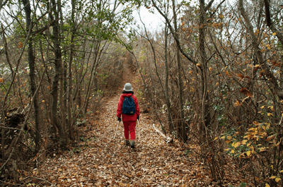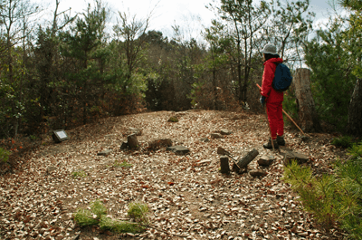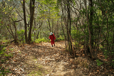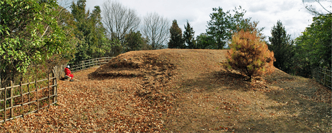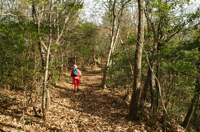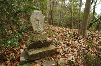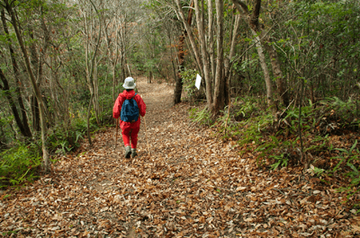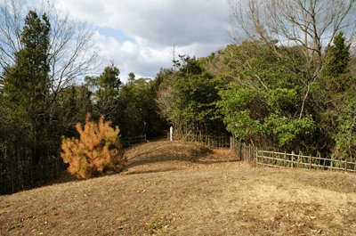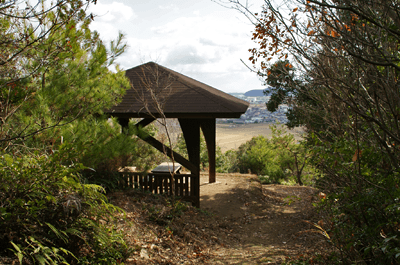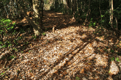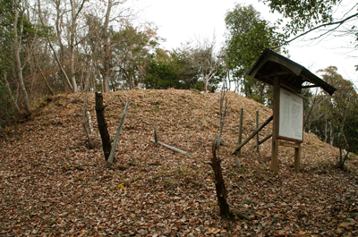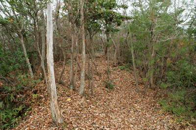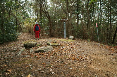 | 養久山はJR竜野駅の北、2kmほどの位置に尾根を東西に長く延ばしているが、最高点でも100mに満たないため、その姿は単なる丘にしか見えない。そのごく低山の尾根にハイキングコースが「養久山遊歩道」の名で作られているのは、尾根に点在する古墳を巡ることを目的としたものと思われる。ハイキング案内板を見ると、古墳の数は40近くあり、数十メートル置きにありそうだった。その古墳散策を2010年12月のクリスマスの日に楽しんだ。 この日の天気予報は晴れときどき曇りだったが、朝の空はその予報よりも少し悪いようで、空の多くを薄黒い雲が占めていた。また播州の北部辺りは荒天になっているようだった。そこで近くで軽いハイキングを楽しもうと考えて、養久山に向かった次第だった。スタート地点は尾根の東端に近い日吉神社からとする。その日吉神社に着く頃には空には少し青空が見られるようになっており、ときおり陽射しが現れていた。神社の境内に車を止めて、神社の右手から始まる遊歩道を歩き出す。数分も歩けば尾根に出たが、そこから山頂方向へは向かわず、一度反対の東へと歩いて、東端側の登山口に下りた。その登山口の様子を眺めた後、引き返す形で改めて東登山口から尾根歩きを始めた。単に東端の登山口から歩き出したいとの、急な思いつきだった。雑木林の尾根はすっかり落ち葉で覆われており、サクサクと落ち葉の踏む音をさせながらの尾根歩きだった。これに小鳥のさえずりだけが聞こえておれば申し分無いのだが、尾根は意外とうるさかった。それは尾根の北側を走る山陽自動車道からの音で、ちょっとした騒音公害だった。山は決して静かではないと言えることが、この尾根歩きで分かった。尾根道をずっと雑木林が囲んでおり、展望は良くなかった。ときおり北の方向に的場山や大蔵山が雑木林の隙間から眺められる程度だった。南も揖保川町の田園風景が小枝の隙間から見える程度だった。尾根はひたすら緩やかに続くので、ハイキングの中でもごく軽い部類だった。また古墳もはっきりとした形のものは少なく、単に墓だったり丘の一部が僅かに盛り上がっているだけに見えるものがほとんどだった。そのため、古墳巡りをしていると言うよりも、尾根の優しい雰囲気を楽しむことを目的とした方が良さそうだった。その尾根のポイントの一つが乙城址で、山頂から500mほど手前のピークにあった。ごく小さな城跡だったが、南に向かって少しは展望があり、また近くに東屋も作られて、休憩場所にもなっていた。そこを過ぎると尾根はいっそう緩やかになり、古墳も一桁台の番号になってきた。送電塔の建つ5号墓を過ぎ、4号墓、3号墓と通過して、山頂にあったのが2号墓だった。三角点は数メートル離れた位置にあり、山頂は標高としては100mを僅かに越しているのではと思われた。そして更に数十メートルほど進んだ所にあったのが、養久山の古墳を代表する1号墳だった。全長32mの前方後円墳で、その形ははっきりとしており、ようやく立派な古墳に出会えた思いになれた。ベンチも置かれて休憩出来るようになっており、ちょうど昼となっていたので、ここで昼食とした。この頃には上空に青空が見えており、古墳は陽射しに包まれていた。暖かい陽射しの中で昼を過ごせることになったのは良かった。その1号墳の位置からは南へと遊歩道歩きを続けてふもとに下りてもよかったが、気楽な尾根歩きを今少し楽しもうと、歩いてきた尾根道を引き返すことにした。往路は陽射しが少なく、寒い中での尾根歩きだったが、帰路は陽射しを多く受けることになり、暖かさを感じながら歩けた。終わってみれば僅か2時間程度のミニハイキングだったが、養久山を十分に楽しめて満足だった。それにしても播州の低山はどうも人が少ないようで、この養久山も終始パートナーと二人っきりだった。 (2011/1記)(2019/6改訂)(2026/3写真改訂) |