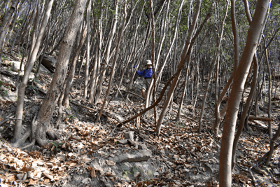 | (天気) | 快晴ながら黄砂が飛来しており、茶色に濁った視界だった。山頂の気温は15℃。風はひんやり感があり快かった。昼休憩をした西斜面の展望地は18℃あり、春の暖かさだった。視界は黄砂の影響でただ悪いの一言。 | ||