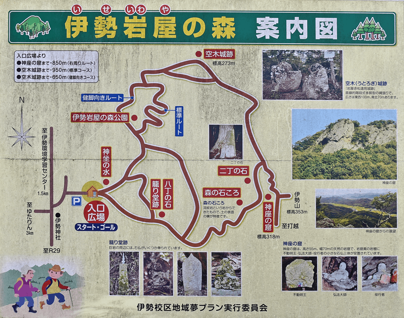 この日は往路コースで空木城跡コースを歩いたが、途中は健脚向きコースを歩いた。案内図では神座の窟のピーク、いわゆる伊勢山西峰は標高318mと