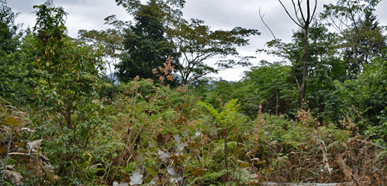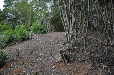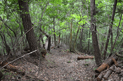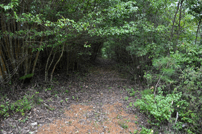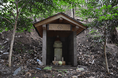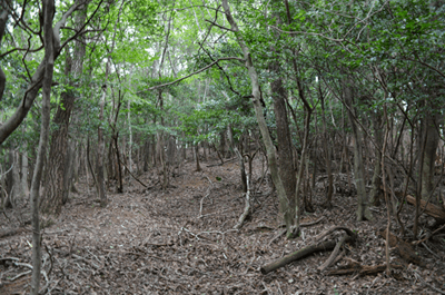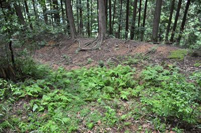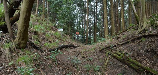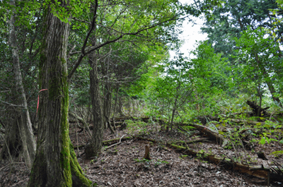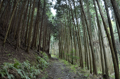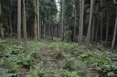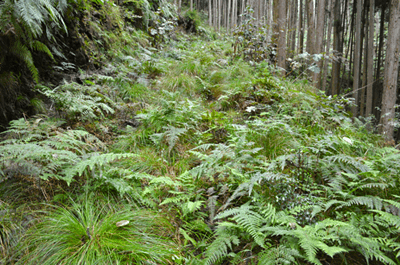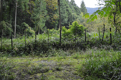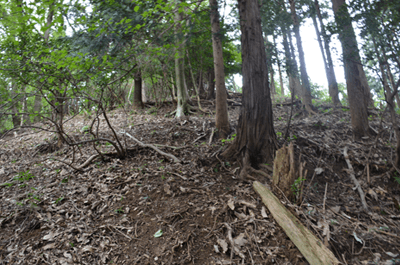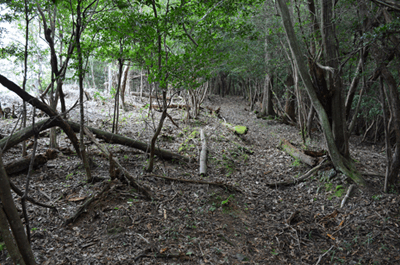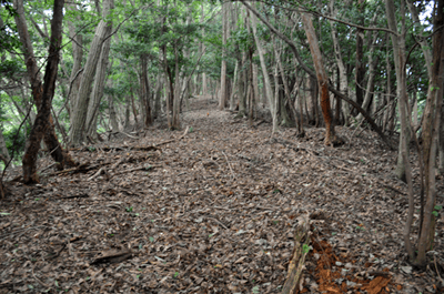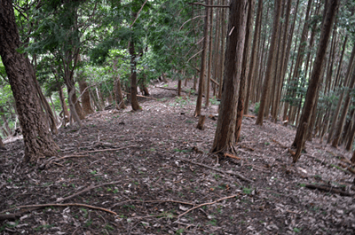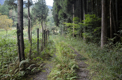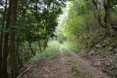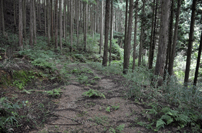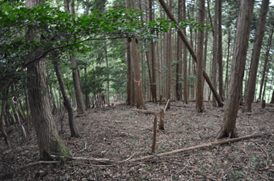2回目の大フゴ山は山崎町川戸側から周回で歩くことにした。地図を見ると大フゴ山と禅師山とを結ぶ尾根の中間、峠の位置まで実線で描かれた道があり、車でかなり近くまで進めそうだった。但し峠まで車を進める気は無く、峠から600mほど離れた二つの作業道が合流する位置に駐車することにした。 向かったのは2016年9月の最終日曜日のこと。この日は曇り空で、揖保川沿いの車道から見る大フゴ山の姿は暗かった。川戸集落を抜けて東に真っ直ぐ向かう作業道の入口まで来てみたのだが、作業道は入口から荒れており車を進める気にはなれなかった。そこでもう一つの作業道に入ってみると、そちらは林道と言ってもよい舗装路で、スムーズに走れた。ところが程なく墓地が現れると、舗装部分はそこまでで、その先は雑草に覆われた土道だった。やむなく墓地のそばに車を止めて歩き出すことにした。土道は始めこそ雑草に覆われていたが、すぐに雑草は消えた。但し悪路と言えそうで、小石が多かったり抉れている所もあった。それもあってか車が通行した形跡は無かった。その作業道は暫く平坦に続いた後、下り坂となって北の方向に向かうと、沢沿いの作業道に合流した。そこが当初考えていたスタート地点だった。そこより東の方向へと歩いて行った。その作業道も悪路で、雑草に覆われていたり石がごろごろしていたりと、やはり車の通行は無いようだった。その悪路のままに上り坂となり、峠が近くなった位置で終点となった。その先は雑草に覆われた山道で、数分で峠に着いた。そこには地蔵さんが置かれており、初めて大フゴ山の標識を見た。標識は北に向かう尾根の起点に立っていたのだが、反対側の南に向かう尾根の起点には禅師山の標識が立っていた。一息入れて尾根に取り付いた。尾根道としてははっきりしない所もあったが、目印が点々と付いていたので、コースを外すことは無かった。また下草が少ないとあって無理なく登れた。その尾根の途中で送電塔が現れたが、そこに展望は無かった。すぐに先へと進んだところ、少し登った位置で展望が現れた。そこは西側が伐採地になっており、山崎の町並みや北西に水剣山が眺められた。時間は11時半を過ぎていたので、その展望地で昼休憩とした。20分ばかり休憩の後に尾根歩きを再開すると、前方に山頂が見えてきた。ごく普通に歩けてきたので、その感じで山頂に着けると思っていたのだが、山頂が目前になると山頂一帯はすっかり草ヤブになっていることが分かった。そこにイバラが混じっており、更に幾つも倒木があってなかなか面倒だった。その草ヤブをかき分けて山頂に立った。三角点はと見ると、ススキに隠され気味になっていたので、少しばかりススキを刈って三角点を顕わにした。改めて周囲を眺めると、雑木が囲んでおり展望はほとんど無かった。そこで暫時の休憩で山頂を離れることにした。この日は周回で歩く予定だったので、西方向の尾根に入った。その頃より小雨が降ってきた。早く下山したかったため、地図をザックに隠して急ぎ気味に下った。西尾根は往路の尾根よりもはっきりしており、少しばかり歩き易かった。50mほど下って小さなピークに出ると、そこからは南の方向が眺められて、そこに禅師山を見た。そのピークのそばに送電塔が建っており、その先も登山道が続いていたので安心して下った。登山道は巡視路で、いつの間にか主尾根を離れて支尾根を下っていることに気付いた。そこで位置を確認すれば良かったのだが、その頃には本降りの雨になっていた。そのため早く麓に着こうとの一心で下った。尾根には送電塔が建っており、二つ目の送電塔の先で山裾道に合流した。どうやら登山口に着いたようだが、そこに標識は無かった。その登山口からなぜか高速道路が間近に見えていた。ちょっと訝しく思った後、すぐに事態が判明した。どうやら南の尾根を下らずに、真逆の北の尾根を下ってしまったようだった。地図を見ていなかったことが悔やまれたが、もう後の祭りだった。山裾を回って戻るのは現実的で無いため、少し思案した後、歩いてきた道を引き返すことにした。言い換えればもう一度大フゴ山の山頂に出ることにした。まだ13時過ぎだったので、時間が十分にあることは助かった。西尾根に戻って再び山頂に立ったのは14時前のこと。雨は本降りになったり小雨になったりの繰り返しで、止むことは無かった。後はほぼ下りばかりなので気分は楽だった。結局、この日は大フゴ山を2回登山したことになったが、大きな山でも無かったので、疲れ具合としては1回の登山分程度だったと言えた。次こそは周回であるこうとザックを下ろして足下を見ると、靴に山ヒルが貼り付いていた。そのときまで宍粟の山に山ヒルが多いことをすっかり忘れていた。あわててズボンの裾をまくって足を眺めると、きっちり3匹の山ヒルが付いていた。もう自分の不注意を責めるしかなかったが、へこんだ気持
