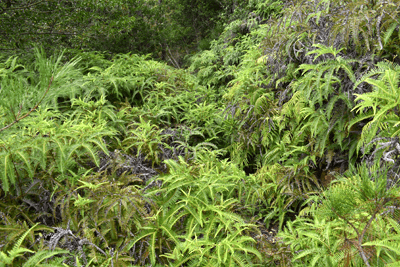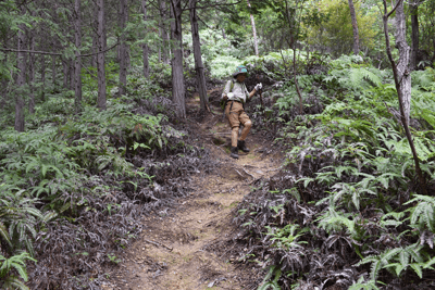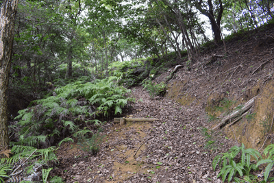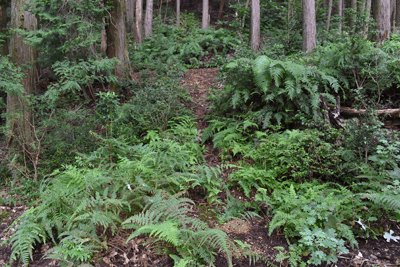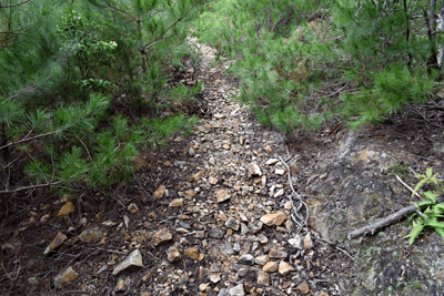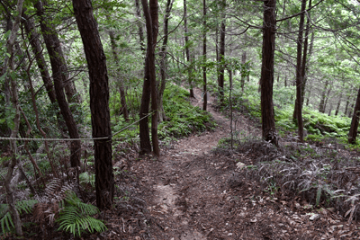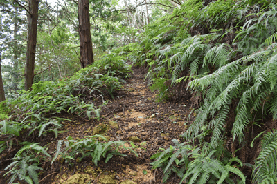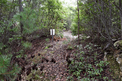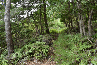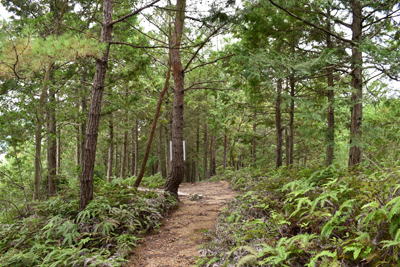 稲荷山の登山コースは南コースと北コースの2コースがあり、過去5回の登山は総て南コースで登っていた。北コースは下山コースとして一度歩いただけだった。そこで一度は北回りコースを往路とすることにした。向かったのは2025年9月の中旬、終日曇りが予想された日だった。駐車地点はいつもの通り南東麓も墓地とした。そこより北へと農道歩きでスタートした。登山口に向かえる小径が分岐する位置にはコース案内図があり、すんなりと登山口に向かえた。ゲートを抜けて山道に入った。始めはごく普通の里山道を登る雰囲気だったが、登るにつれて足下に小石が増えてきた。手入れがされないままに表土が流されたようだった。シダも茂って道を隠し気味になってきた。明らかにマイナーコースだった。その上、この日はけっこう蒸し暑さがあり、大汗をかいての登りとなった。歩き難さが続くことで、徐々に歩度は鈍ってきた。東尾根に出ると緩やかな道となったが、歩き難さは続いた。漸くの思いで南回りコースに合流すると、ほっとする思いだった。そこは山頂まで100mの位置とあり、後は最後のひと踏ん張りとばかりに休まず登って山頂に着いた。天気予報通りに曇り空の山頂だった。その山頂が一年前の登山と比較して、すっきりしている印象を受けた。どうやら展望を妨げていた雑木が伐られたようで、東から南にかけての展望が良くなっていた。足下の鶴居の田園風景も眺められた。山頂の気温は高めだったが、ときおりは涼しい風が吹いてきて、暑さを気にするほどではなかった。山頂で40分ほどの休憩を終えると、下山は南回りコースを下ることにした。こちらは至って歩き易いハイキングコースで、ヤブの要素は全く無かった。それでもやや急坂が続くので、足下に注意は必要だった。登山道は周囲の自然林と調和しており、シダもアクセントになっていた。その風景を楽しみながらマイペースを心掛けて下った。下山の所要時間は30分ほど。 北コースが難路コースになってきたことでもあり、南コースのピストンで山頂展望を楽しむのが正解ではと思ったのが、下山を終えての感想だった。 (2025/10記) |