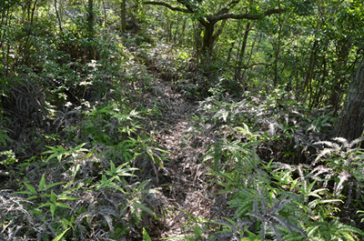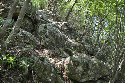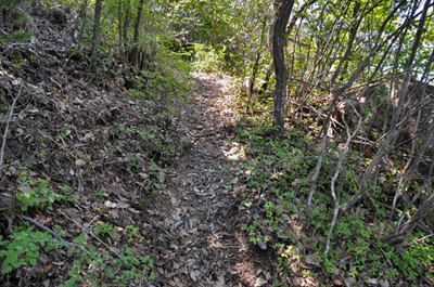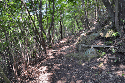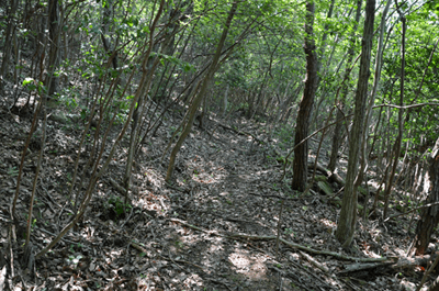 | 西脇市北東、旧西脇市と旧黒田庄町とを分けていた尾根にこの風変わりな名を持つ山が立っているが、この三角点山を初めて登ったのは2003年6月のことだった。適度な歩き易さの登山道と、山頂展望の良さが記憶に残っている。それから10年後の同じ季節、同じ日に再訪することにした。暑い季節となったので午前のみで済ませられる山を登ろうと考えたとき、この三角点山を思い付いたものだった。コースについては特に変化を付けるつもりは無く、前回と同様に福谷池のそばからの愛宕コースを登って山頂へ、そして下山は南福谷コースを下ろうと考えた。 この日は梅雨の中休みで、朝から快晴の空が広がっていた。視界も良いようだった。福谷池に着いたのは9時過ぎ。その福谷池の先に別の小さな溜め池があり、その前から岡稲荷神社への赤い鳥居が並んでいた。また溜め池のそばに駐車スペースを見たので、そこに駐車とした。岡稲荷神社の脇から登山コースが始まっていたことを記憶していたのだが、その登山口地点の記憶が曖昧で、神社の右手に小径を見たときそれだと思って、その小径に入ってしまった。すぐにヤブっぽい道になってしまい、シダが被さる所も現れた。これは違うとすぐに分かったが、それでも無難に歩いて行けたので、そのまま進んで行くことにした。小径は終始薄暗い林のを続いていたが、そのままの雰囲気で傾斜がきつくなってきた。そのうちに小径も不確かになってしまった。これは思惑が違ったと反省したが、それでもシダをかき分けて進んで行くと、突然のように登山道に合流した。それが本来登って来る予定だった愛宕コースだった。後はその登山道で山頂を目指すのみ。山頂までには小さなピークを越すことになり、次第に展望が現れるようになった。それまで木陰の中を歩いていたので暑さは感じなかったのだが、陽射しを受けるようになって一気に暑くなってきた。木陰の中では24℃ほどだったのだが、陽射しの下で温度計を見ると、30℃になっていた。山頂に着くとそこは開けていたため、陽射しをまともに受けることになった。これは堪らないとばかりに、少し戻って木陰の中で休憩とした。そして一息つけたところで改めて山頂に立った。前回と比べると樹木が生長したために幾分展望は悪くなっていたが、それでも北東間近に妙見山の尾根が眺められた。東には西光寺山、北西には千ヶ峰も眺められた。登ってきた甲斐があったと言うものだった。さて下山だったが、始めの考えでは山頂手前から分かれる南福谷コースを下ることにしていたのだが、愛宕コースをしっかりと登山口まで歩いてみたくなった。どこが登山口だったのかを知っておかないと、どうも気分がすっきりとしなかった。そこで引き返す形で下山を開始した。始めは尾根なりに北西へと向かい往路での合流点を過ぎると、西方向へとどんどん下った。ごく普通の登山道として道幅は十分にあり、楽々と下って行けた。方向は西から南西となって最後は車道に合流した。そこからは岡稲荷神社が目前に見えていた。この登山口を憶えておれば要らぬヤブコギをせずに済んでいたのにと思ったが、後の祭りだった。まずは登山口を知ったことで胸のもやもやが解消したのは良かった。そして再び鳥居の並ぶ参詣道を歩いて駐車地点へと戻って行った。 (追記) 下山後にインターネットで三角点山の三角点を調べたところ、なんと国土地理院の地図から三角点記号が消えていた。山頂にはまだ二等三角点が残っていたのに、これはどういうことなのだろうか。地図の間違いかそれとも除外されたのかどうも判然としないが、もし除外されたのであれば、これでは三角点山の名の根拠がなくなってしまうのにと要らぬ心配をしてしまった。(最新地図ではまた復活していた。2021.3.20) (2013/7記)(2021/3改訂)(2026/1写真改訂) |