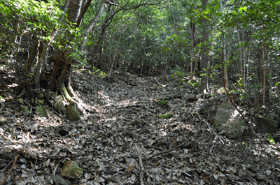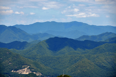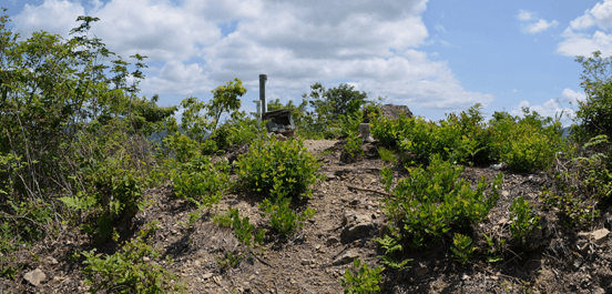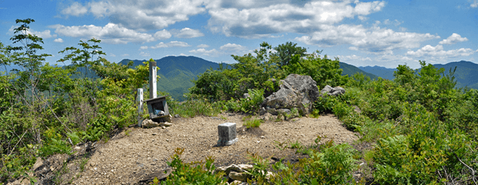 | (天気) | 少し薄い色ながら青空の広がる空だった。雲は僅か。登山口の気温は22℃で、山頂が近づくと24℃まで上がっていた。山頂の陽射しの下では30℃の暑さだった。木陰で憩っていると、ときおり涼しい風を受けた。視界は悪く無かった。 | ||