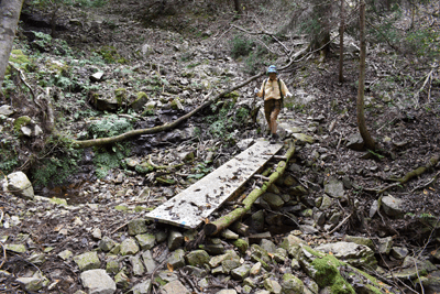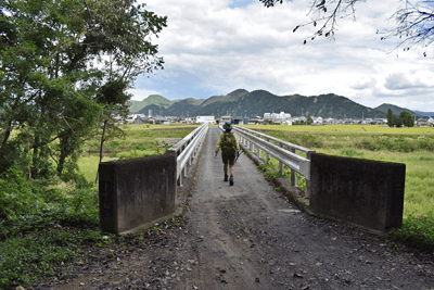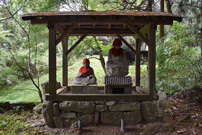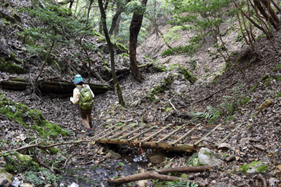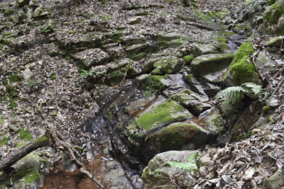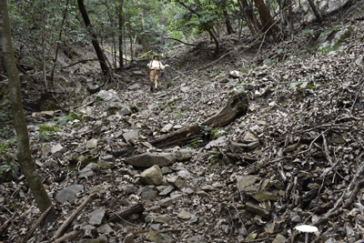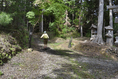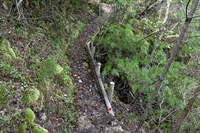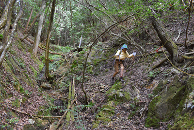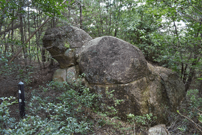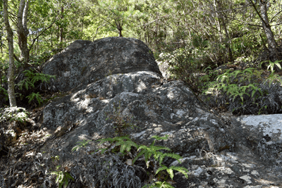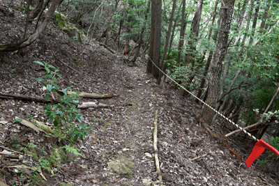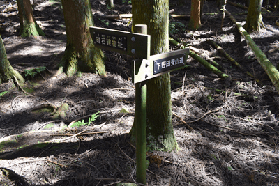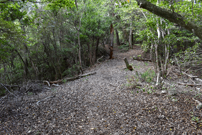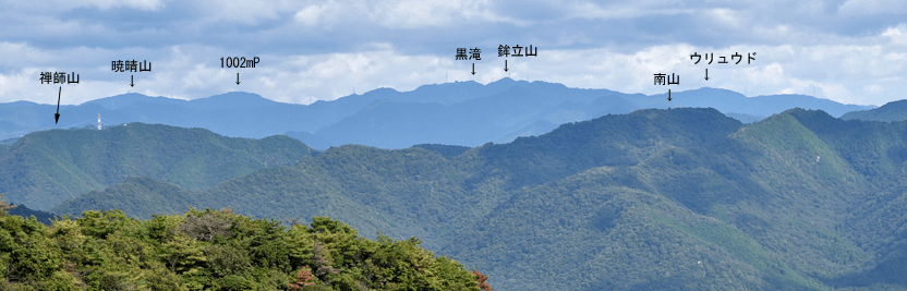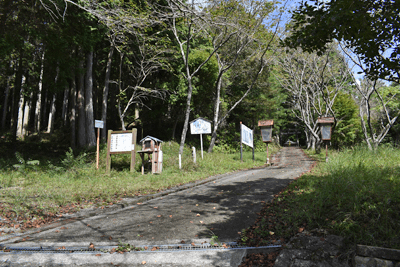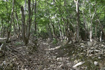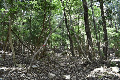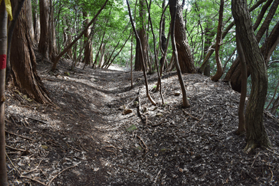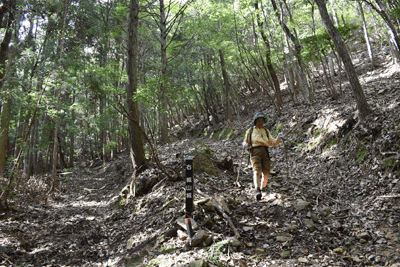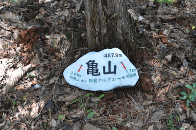 | 2025年は夏の暑さが長く続き、9月も下旬になって漸く涼しい日が現れるようになった。そこで少し厳しさのある山を登ろうと向かったのが新龍アルプスの亀山だった。3年ぶりとなる亀山を前回と同じく馬立登山口kらの大手道コースで登ることにした。登山口にある墓地の駐車場に着いたのは10時15分。陽射しで明るい墓地は、ひっそりとしていた。始めに姥塚古墳群を抜け、小さな沢に沿って西へと歩いた。沢そばを離れて上り坂に入ると、急坂がずっと続いた。気温は27℃ほどだったが、けっこう大汗をかいての登りとなった。稜線が近づいて展望地が現れると、たまらず休憩とした。この日の視界は悪くなく、展望地からの眺めははくっきりとしていた。その展望地から6分で稜線の縦走路に合流した。まだ山頂まで1kmほどあった。但し、縦走路は緩やかな道として続いており、易しい尾根歩きだった。途中にある亀岩は、この日は愛らしい顔つきだった。緩やかな尾根歩きのまま、合流点から30分近く歩いて山頂に着いた。以前は展望があった山頂だが、来る度に木々の密集度は増しており、展望は欠片も無かった。ただ木陰はたっぷりあり、涼しさを楽しむには申し分無かった。その山頂でゆっくり昼休憩を済ませると、下山は下野田コースを下ろうと縦走路を更に南へと歩いた。緩やかに下って植林地に入ると、その辺りは城跡の中心部となるのか幾つか標識が立っていた。そして下野田コースが分岐する位置まで来ると、そこに一際目立つ標識が立っていた。展望所まで100mとあった。それを見てピンときた。麓から亀山を眺めたとき、山頂から見て南東の位置に広く伐採された所があったが、どうやらそこが展望所のようだった。その展望所に通じる小径に入ると、すぐに伐採地に出た。そこも城跡のようで、幾つか幟が立っていた。展望は北東から南東まで広範囲に眺められて、以前の山頂展望が思い出された。午後も澄んだ視界は続いており、遠くは笠形山も望めた。その展望地での休憩を終えると、引き返して下野田コースに入った。別名、ひょう糧道コースだった。道ははっきりしており、荒れた感じは無かった。そのまま無理なく下って行ければ良かったのだが、途中から沢沿いを歩くようになると、急坂が続くだけで無く、岩の上を歩いたり足下が脆くなっている所を歩いたりと、俄然険しさが出てきた。とにかく滑らないようにと慎重に下った。大手道よりも険しさは数段上ではと思われた。それでも麓が近づくと傾斜は緩んで、最後はゲートを通って車道に出た。登山具陳美は標識があり、説明板も立っていた。後は馬立登山口を目指して、ひたすら車道歩きを続けた。ところで馬立登山口と下野田登山口の中間地点には登山者用の広い駐車場があるので、この日のように周回で歩くのであれば、そこに駐車するのがベターではと思えた。また馬立登山口の駐車場はあくまでも墓地利用者のものなので、平日以外でもそちらが良いのではと思えた。 (2025/10記) |