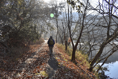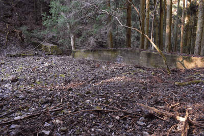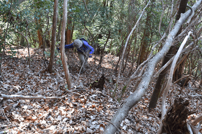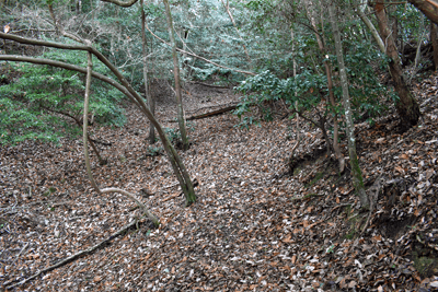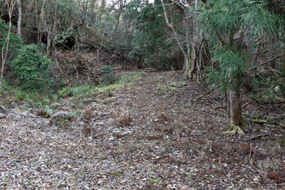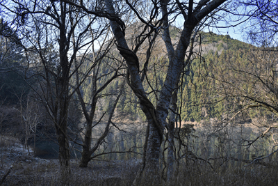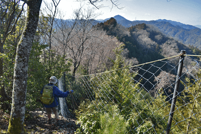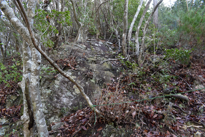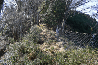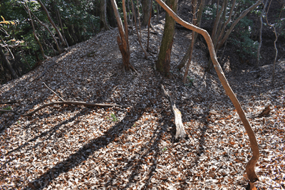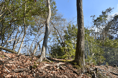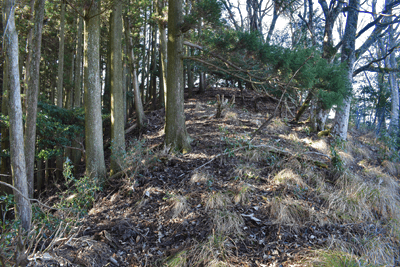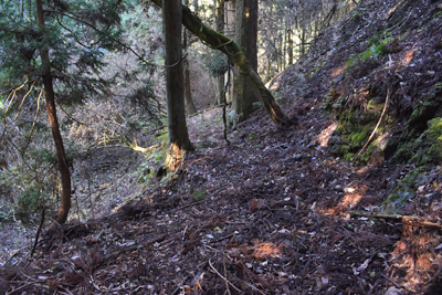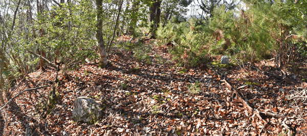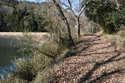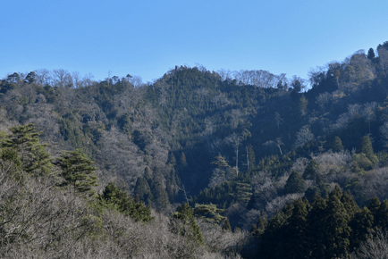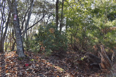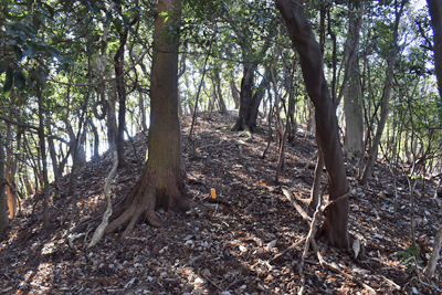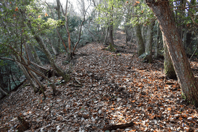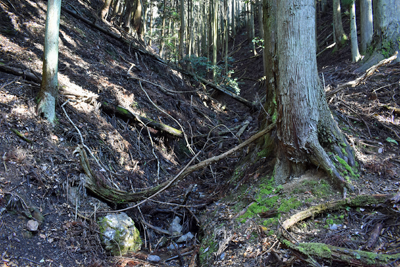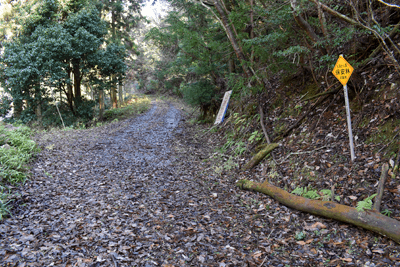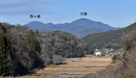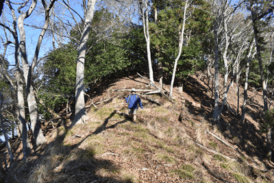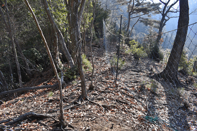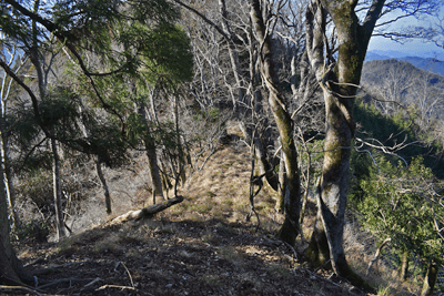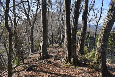 | この天狗岩は高城山から南へと続く尾根上にあり、地図では無名の520mピークだったが、「兵庫丹波の山」では天狗岩の名で紹介されていた。地図を見ると西と南西に破線路があり、周回で歩けそうに思えた。また距離も手頃そうだった。そこで周回で歩こうと向かったのは2025年12月の正月休暇に入っての一日だった。前日に高城山を登っており、その高城山を見ながら国道372号線を離れて殿町集落への道に入った。その先にある溜め池を目指して進むと、害獣避けゲートが現れた。それを抜けた先はダート道となり、程なく溜め池に着いた。溜め池の土手に車を止めてもよかったが、少し手前に「林道滝谷線起点」の標識があり、そのそばの駐車スペースに車を止めた。朝の丹波篠山市は霧に包まれていたが、その霧が薄れて快晴の空が広がろうとしていた。まずは林道歩きでスタートした。溜め池の東岸側を歩いて行くと、左手に小径が分岐した。その小径が地図の破線路だった。その小径を道なりに東へと歩くと、ネットに阻まれた。地図ではその辺りから左手の斜面をジグザグに登ることになっていたが、そのような小径は見当たらなかった。直進方向もヤブになっていたので、北へと斜面の歩き易そうな所を登って行くことにした。急斜面を登って尾根に出ると、そこからは南東へと尾根を辿った。尾根筋はネットが張られており、それに沿って歩きたかったが、灌木ヤブになっていた。そこでネットとは付かず離れずの感じで進んだ。とにかく歩き易い所を探って進んだ。西向かいの尾根を見ることがあり、その尾根の先は三国ヶ岳だった、一つ北隣の尾根と合流すると、漸く尾根上を辿れるようになったが、まだ雑木ヤブを登る雰囲気ではあった。その尾根もネットが張られていた。そのヤブっぽいままに天狗岩の山頂に着いた。山頂は少しは開けていたが、ヤブの山頂とも言えそうで、天狗岩の名には相応しくなかった。その山頂には珍しく山名標識は無く、ただ三等三角点(点名・八上村)を見るだけだった。展望は少しあり、南西に三国ヶ岳を見た。また丹波篠山市街も望めて、その背後に見るのは黒頭峰だった。まずはマイナーな山頂ではあった。下山は予定通り周回で歩こうと、南西尾根に入った。その南西尾根はヤブの要素は全く無く、スムーズに歩けた。おまけに右手は展望が広がっており、快適尾根だった。二つの500mピークを越して467mピークに着くまで続いた。467mピークを過ぎて鞍部に着くと、そこからは右手の斜面に入って破線路を辿るのだが、その破線路の分岐点がはっきりしていなかった。地図を見て丁寧に谷筋に入れば良かったのだが、分岐点を通り過ぎたとき、右手に小径が分岐しているのを見た。その小径でも問題無さそうなので、辿って行くことにした。荒れた道ではあったが、難路と言う程でもなかったのでどんどん下ると、無難に破線路コースに合流することになった。後は破線路コースを辿って行く。沢沿いのはっきりした小径となり、最後は林道に合流した、林道を北東へと歩いて行くと、5分ほどで溜め池のそばに出てきた。もう駐車地点までは僅かな距離だった。下山を終えた後に溜め池の土手に立つと、そこは三嶽の展望があって明るい三嶽が眺められた。 (2026/1記) |