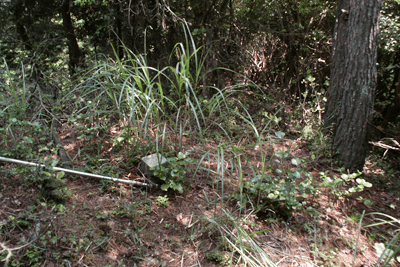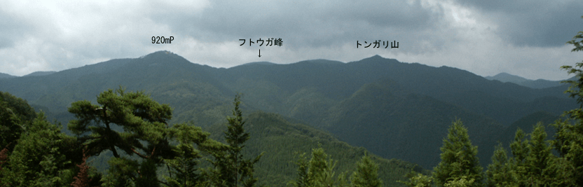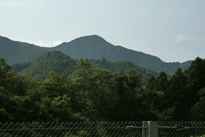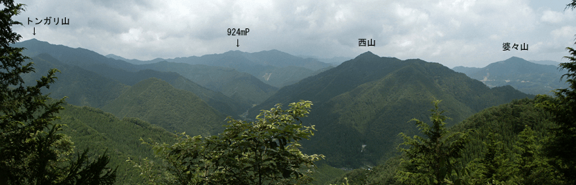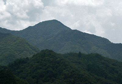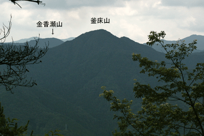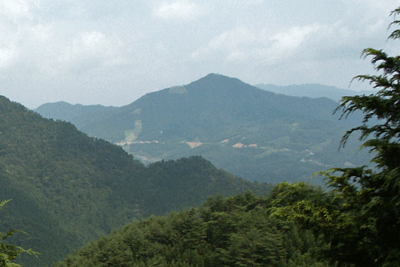 7月11日は快晴の予報だったが、但馬が近づくと上空は雲が増えてきた。弱い陽射しで薄晴れと言えそうな空だった。登山コースを決めずに向かっていたのだが、朝来町に入って適当にこの山の東面側に近づくと、何となく播但自動車道の側道に入ってしまった。そして朝来第2トンネルの北口そばで行き止まりとなった。ただそのそばのフェンスには扉があり、そこより山中に入って行けるようになっていた。また細流があり、それに沿って小径らしきものも見えていた。地図で現在地を確かめると、この近くの尾根で山頂に向かうのも悪くないと思えた。山頂までの距離が短過ぎる気もしたが、その側道終点より登り出すことにした。なお、その位置より南東を見ると、釜床山の山頂部がすっきりと見えていた。フェンスの扉には鍵が無く、すんなりと入って行けた。そして薄暗い細流沿いの小径を歩いて行った。その小径ははっきりしたものでは無く、すぐに消えてしまった。そこで南に見えていた尾根に上がることにした。小笹のまばらな斜面を登ると、ごく簡単に尾根上に出た。植林地の緩やかな尾根で、小さなこぶを越すと、後は山頂まで一気に登るだけだった。尾根にはハッキリとした道は無かったが、下草も少なく気楽な感じで登って行けた。ただこの日の湿度は高く、すぐ大汗になってしまった。尾根はやがて雑木が主体となり、明るい緑の風景に変わった。登り出したときは植林で終始するのかと考えていたが、けっこう垢抜けた風景だった。木の間越しにちらちらと釜床山も見えていた。山頂が近づくと急坂となって来たため、休み休み登って行った。木に掴まりながら急坂を登りきると、はっきりとした尾根に合流した。そこより一登りしたところが三等三角点(点名・伊谷)が置かれた山頂だった。少々雑然とした感じの山頂で、三角点もなかば草に隠されていた。周囲は雑木が取り囲んで展望も無かった。暑い最中に辿り着いた山頂だったが、ちょうど陽射しが山頂を照らしており、火照った体には厳しい暑さだった。まずは陽射しを避けて適当な所に落ち着きたかった。疲れた体で辺りを探ると、すぐに絶好の場所が見つかった。三角点の位置から南西へ20メートルほど離れただけで、涼しげな風が通っていたのである。適度な木陰となっており、すぐに倒れ込んでしまった。そして暫し死んだように眠っていた。体の火照りが冷めると、少し肌寒ささえ感じてきたので、気温を見ると22℃だった。この山上で快い涼しさに出会えるとは思っていなかっただけに、何とも得した気分だった。しかし季節がら嫌なものにも会ってしまった。手のひらに痛みを覚えて見てみると、そこに山ヒルが貼り付いていた。すぐ払い飛ばして他を見ると、ズボンの裾にもう一匹貼り付いていた。それでも気にせず、眠りの続きを楽しんだ。人心地がついたところで、この山頂からの展望を得ようと辺りを探った。南は全く樹林に阻まれていたが、北側の急斜面を少し降りると、西から北にかけてを木の間越しだったが、少し展望を得ることが出来た。西にはトンガリ山が、そして北の婆々山までが眺められた。ただ視界は水分を多く含んだ空気のために薄ぼんやりとして、眠たげな風景になっていた。下山は尾根を変えて下ることにした。まず南北に長い頂稜部を北に歩き出したのだが、少し歩くと展望が現れた。西の植林がまだ若く、その梢越しに生野高原方向が眺められた。その位置より東へと尾根を下り始めた。緩やかな尾根で、ひざ丈ほどの笹が広がり、雑木も疎らで歩き易い尾根だった。東方向に下るので、木の間越しだったが法道寺山から行者岳へと続く尾根がちらちらと見えていた。良い雰囲気で終始歩き易いままに下っていたのだが、中間点辺りより次第に笹丈が大きくなって来た。やがて胸丈ほどになり、また傾斜もきつくなって俄然歩き難くなった。我慢して下り続けるしかなかったが、やがて播但道が足下に見えてきて漸く一安心となった。そして側道の法面の上に出て、今日の登山は終わったと思ったとき、大変な災難に遭っていることに気がついた。ズボンにいっぱいひっつき虫が付いていたのである。その数は数百個はありそうだった。情けない気持ちで駐車地点へと戻って行った。