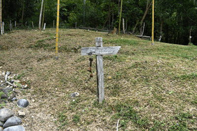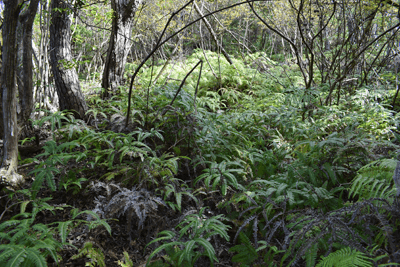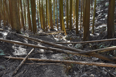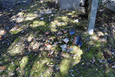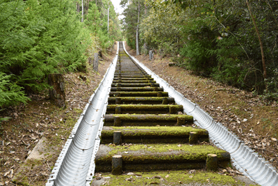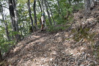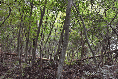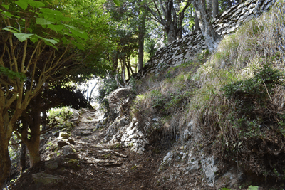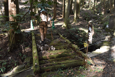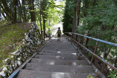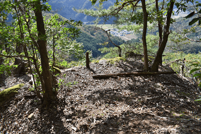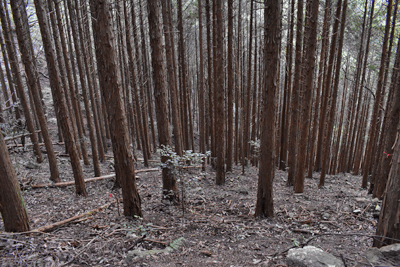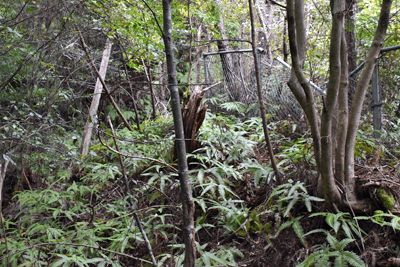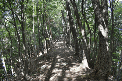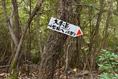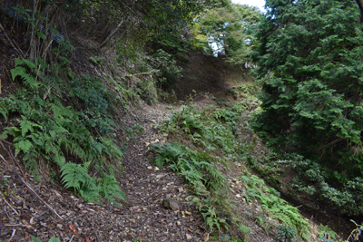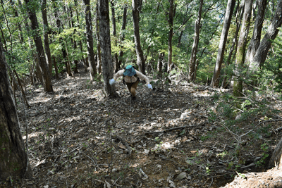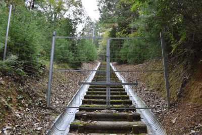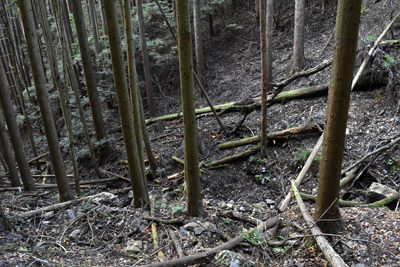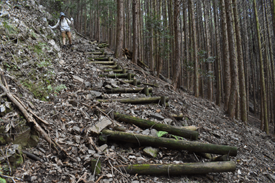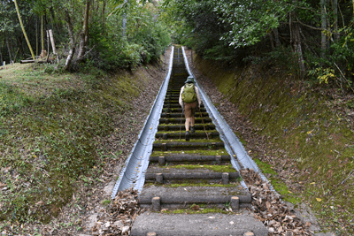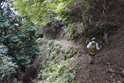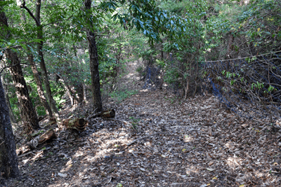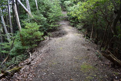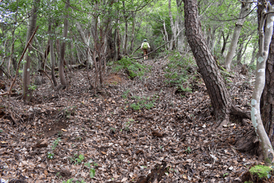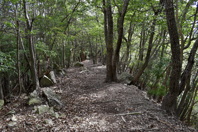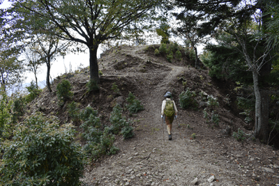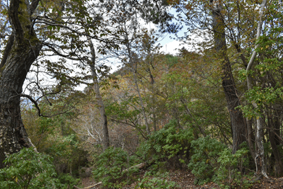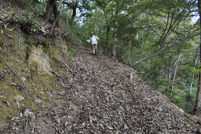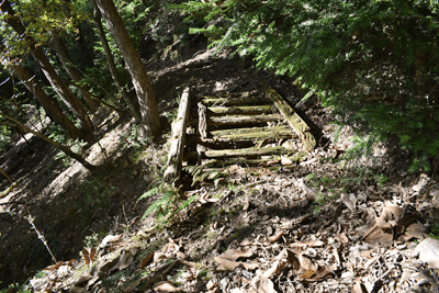 | 長水山の下町コースは1998年に登っていたが、コースの記憶はほぼ消えていた。そこで改めて下町コースを登ろうと向かったのは、2025年10月下旬のこと。天気予報では宍粟市は晴れとなっていたのだが、天気の回復は遅れているようで、古池に着いたときは曇り空だった。ごく細かい雨粒を受けることもあった。古池のそばに車を止めたまでは良かったが、池そばの東屋から始まるコース以外にも、階段状で尾根上を延びる遊歩道を見た。地図を見ると尾根コースとの合流点まで破線が描かれていた。その遊歩道でも易しく登って行けるように思えて、引き返して下町コースに向かうことはせず、遊歩道を登って行くことにした。真っ直ぐ北東へと階段を登って行くと配水池の建物が現れて、階段はそこまでだった。単なる配水池への連絡道だったようで、その先への道は無かった。配水池を囲むフェンスを伝って無理やり配水池の背後に回り込んだものの、その先にも小径は無かった。単に灌木のヤブ尾根を見るだけだった。それでも木々の空いた所を探りながら進めそうだった。引き返さずヤブ尾根を登って行くことにした。ときにシダヤブが現れると、回り込んだりシダヤブをかき分けたりと、とにかく進んだ。斜面がきつくなることがあったが、さほど厳しさは無かった。まずは無難に支尾根を登りきって尾根コースに合流した。後ははっきりした尾根道を歩いて山頂を目指すのみ。尾根コースはほぼ緩やかな道で、始めは左手が植林地になっていたが、進むほどに周囲は自然林となり、雰囲気は悪くなかった。左手から宇野コースが合流すると、「大手道コース」の名が付いていた。その先で尾根筋を離れて巻き道に入り、五十波コースに合流した。五十波コースには「搦手道コース」の名が付いていた。その合流点には「ぽつんと一軒家」が建っているのだが、無住となって久しくなったためにすっかり老朽化していた。屋根は崩れて廃屋状態だった。そこより一登りして山頂台地に着いた。そこからは最高点である三角点ピークへと向かった。鉄階段を登って信徳寺の前に出ると、屋根瓦が散乱していた。お寺の屋根も崩れ始めていた。信徳寺の裏手が三角点ピークで、石段を登って玉垣に囲まれたピークに着くと、そこは小ぎれいにされており、玉垣を繋ぐステンレスパイプは新しくなったのか光っていた。その最高点から信徳寺を見ると、北側の屋根瓦も広範囲で落ちているのが分かった。修復には相当の費用が必要ではと思われた。その最高点で三等三角点(点名・蔦沢2)を確認したり水剣山を眺めたりと暫く休んだ後、南の広場に移動した。雲の多い空だったが、陽射しを受けることも多くあり、そのときは程良い暖かさを楽しめた。その南の広場で昼休憩を済ませると、下山は往路の尾根コースを引き返した。午前に歩いた下町からの合流点まで戻り、更に南東へと尾根を辿ると、下町コースの分岐点が現れた。標識も立っており、「健脚コース」とされていた。その下町コースに入ると、すぐに現れたのが展望地で、南向かいの尾根が眺められた。その尾根で目立っていたのは戸倉山だった。その後も道なりに下ったのだが、登山道は荒れ気味になってきた。それと東の方向へとトラバース気味に下っていることが分かった。すぐにGPSを取り出して現在地を確認すると、地図に描かれた破線コースとは大きく違っていた。一瞬道誤りをしたかと思ったが、枝道が分岐していた所は無く、あくまでも登山道を辿っているはずだった。そこでそのまま下って行くことにした。荒れ気味の登山道だったが、途中では案内板も現れて、やがり登山コースを正しく歩いているようだった。そこで下町コースは地図の破線コースとは全く関係無いと判断した。その下町コースが下るほどにどんどん荒れてきた。石がごろごろしているだけでなく、道が崩れていたりコースのはっきりしない所もあった。谷筋を下るようになると、何度も倒木を超すことになった。これまでの災害が放置されていたようで、ほぼ廃道になってしまったようだった。何とかコースを辿って行くと、漸く歩き易くなってコンクリート製の廟所のそばに出た。そこには水場があり、二体の石仏を見た。その廟所の位置から僅かな距離で古池が見えてきた。最後はゲートを通って東屋のそばに着いた。結局往路ののヤブ尾根の方が歩き易かったようで、下町コースは過去のコースになってしまったようだった。 (2025/11記) |