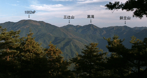 | 二度目は6年後の同じく秋の季節、2001年のことだった。初めての登山で北麓の生栖集落から登山道があることを知ったが、その登山道を単純に往復するのでは面白みは少ないと思え、二つの三角点を踏む計画した。それは下山こそ登山道を歩くものの、登りは花咲山とこの行者山の中間点にある617mピーク(点名・上野田)を通ってから行者山まで尾根を伝うというものだった。 このときの心配は自分の体のことだった。その月の初めに上越の平ヶ岳、越後駒ヶ岳を登っていたのだが、その後なぜか右手の調子が悪くなっていた。まったく力が出なくなっており、そこで整形外科通いをしていたのだが、その日もリハビリを終えてからの出発だった。そのため生栖集落の南隣となる田ノ尻集落に着いたときは11時になっていた。その田ノ尻集落のそばを揖保川が流れており、そこに架かっている小橋を渡った対岸側に駐車とした。まずは尾根に手っ取り早く出ようと、田ノ尻集落から始まる林道を登って行った。集落を抜けて行くと道は舗装路からダート道に替わった。荒れ道であまり利用されていないようだった。つづら折れで登って林道の終点に着いたが、そこから地図では尾根まで破線路が示されていたのだが、それらしき道が見当たらなかった。(最新の地図では破線路は消されていた。)とにかく尾根に出ようと山の斜面を適当に登ることにした。笹と灌木が繁ってけっこう煩わしかったが、数十メートルほどヤブコギをすると、山道に出会った。どうやら地図の破線路らしい。その道を歩いて南麓側にある上野田集落との峠に出た。峠には尾根に沿って防鹿ネットがあり、傍らに小さな祠があった。峠道の名残であろうか。ただ辺りは全くのササヤブになっていた。そこからはまず南西に向かって、予定通り四等三角点(点名・上野田)のある617mピークを目指すことにした。尾根こそササが繁っていたが、少し尾根を外すと植林帯になっていたので、尾根と平行にその植林帯の中を歩いて行った。少し歩くと尾根に共同アンテナが立っており、そこからは南東に向かっての展望が開けていた。やがて尾根は北西に曲がったが、その辺りからは全くの植林帯となり、俄然歩き易くなった。そして尾根はまた南西へと向かい出した。自然林も混じり出した尾根は、下生えが少なく気楽に登って行けた。ただ展望はほとんど得られなかった。やがて着いた617mピークも雑木に囲まれており、展望は無し。スタートが遅かったため、この時点で12時半ばになっていたので、ここで昼食とした。30分あまりの休憩の後、いよいよ行者山に向かって歩き出した。峠までは同じ道を辿るのだが、尾根が途中で南東に曲がる所を真っ直ぐに下ってしまい、コースに戻るのに少し時間をくってしまった。峠に戻り着くと、その先に尾根道の名残なのか消えかかった小径を見たが、ほとんどササと灌木に隠されていた。 ほぼヤブコギ状態で登って行くが、それ以上に蜘蛛の巣が多く、厳しい登りだった。また木に掴まりたくても右手がやや不自由なのもやっかいで、徐々にしか登って行けない。尾根には終始防鹿ネット(鉄線)が続いていた。尾根登りを続けるうちに傾斜がきつくなってきた。そのためか振り返ると、登ってきた方向の展望が開けていた。先ほど登った617mピークの右手には黒尾山が見えていた。そこを過ぎて暫くするとササが消えて漸く歩き易くなった。自然林の広がる尾根は、もう黄色く色づき始めていた。行者山の三角点ピークに着く前に双耳峰のもう一つのピーク(740mピーク)を越すのだが、そのピークが近づくと尾根には大石がごろごろと散らばる風景となった。そして740mピークにようよう着いた。そこにも石仏が置かれていた。そこからははっきりした山道を歩くことになった。山頂との鞍部辺りで生栖集落からの道が合流したる。そして山頂へと最後の登りにかかった。山頂への急坂が始まる手前に小屋(行者堂)があり、そこに立ち寄ってこの山が生栖行者山と呼ばれていることをこのとき知った。やや急坂を登って山頂へ。二度目の山頂だったが、遠く藤無山から須留ヶ峰までの稜線が遮るものも無く見渡せた。間近にも東山がどっしりと見えており、右手には高峰に大段山も見えている。北西遠くの大きな山は三室山か。この展望に出会いたくて登ってきたのだが、再び目に出来て、来て良かったとの思いがしみじみと湧いてきた。この展望以外にも少し位置を変えると、暁晴山や雪彦北部の山並みも眺められ、夕暮れの雰囲気が迫りだした中で暫しの時を過ごした。16時を回ったところで下山とする。下山は生栖集落への登山道を下って行く。緩やかにつづら折れで下って行くが、周囲は終始植林帯で薄暗かった。降り着いた所に祠があり、そのそばで林道に合流した。そこに石碑があり、「行者山登山記念」と記されていた。後は林道・能栖線を下って麓に向かって行くと途中にゲートあり、生栖集落に下り着いた。そして揖保川