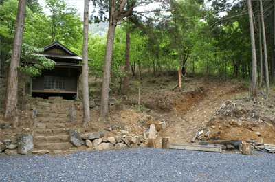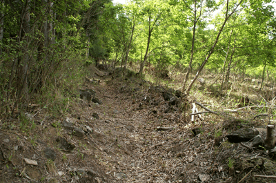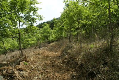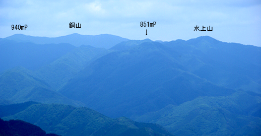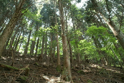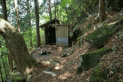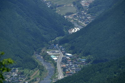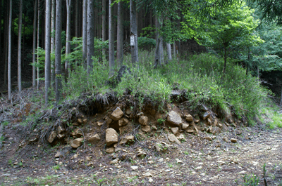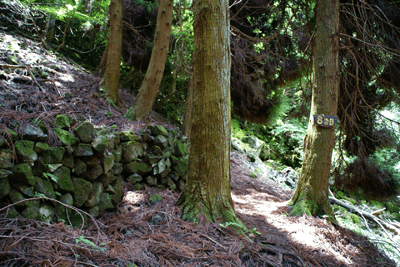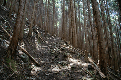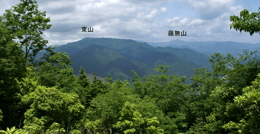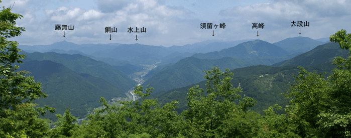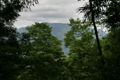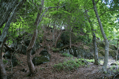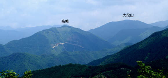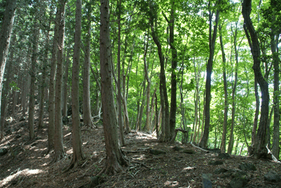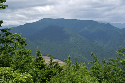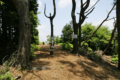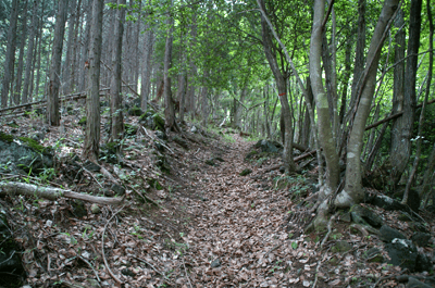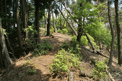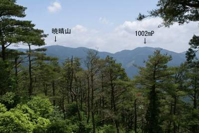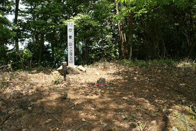 | 暁晴山から西へと延びる尾根は最後は花咲山の山塊となって揖保川そばまで来ているが、その中ほどに小槍を従えた姿の良い山が一ピークを作っている。それが行者山で、その特徴ある姿はけっこう遠くからでも目立っており、播但尾根からも眺められる。その行者山は姿の美しさだけで無く山頂展望にも恵まれているとあって、宍粟50山にも選ばれている。その行者山を突然の思いつきで訪れた。 2009年6月に入っての最初の日曜日は、快晴の空で朝を迎えた。その空を見て急に鳥取の山に登りたくなった。そこでパートナーを誘ったところ、急とあってあっさりと断られてしまった。それでは一人ででもと勇躍向かったのだが、北の空はどうも雲が多いようだった。ただ青空も見えていたので安心していると、その天気が大暗転した。戸倉トンネルに入るとき、上空は曇り空かと見たのだが、鳥取側に入るとそちらは雨だった。若桜町の市街に近い所まで進んで、そこで暫く様子を見ることにすると、30分ほど待つうちに雨は小止みとなった。ただ上空はガス雲が広がったままで、周囲の山並みもすっかりその中だった。昼ごろまで待てば良くなるかも知れなかったが、そこまで待つ気は無く、諦めて引き返すことにした。その空が兵庫側に戻ると、少し雲が多いものの青空が覗いていた。そして旧波賀町の中ほどまで来ると、上空はすっかり青空だった。そこでそのまま帰るのはもったいなく、手頃な山で軽いハイキングを楽しむことにした。但し地図を持っていないため地図無しでも気軽に登れる山はと考えて、思い浮かんだのが行者山だった。国道29号線を安積橋の交差点で左折して揖保川沿いの県道に入る。その県道6号線を数分も走れば生栖の里で、標識のままに県道を離れ集落内の急坂道に入る。車道はすぐにダートの林道へと変わって、急坂のまま山中を進んで行った。程なく五合目の標識が現れ、そこは小さな広場になっており、休み小屋やお堂が建っていた。そこが生栖側の登山口で、広場の隅に車を止めた。他に車は見えなかった。この行者山は三度目の登山となるのだが、この位置へと下ってきたことはあるものの、登るのは初めてだった。お堂の横から登山道が始まっている。前回に下山したときの記憶では、この生栖の道はほとんど植林地の中を歩くだけで、少し面白味に欠けるとの印象だったが、それは変わっていないようで、ときおり雑木が混じるものの、ほぼ植林の中を展望も無く登って行く。ただこれも運動と考えれば、適度な上り坂がずっと同じ感じで続くので、リズム良くは登って行けた。コースには何合目を示す標識が付いていた。またコースは尾根を登るのでは無く、傾斜のきつい山肌をつづら折れで続いていた。まずはマイペースで歩いて、歩き始めてから50分ほどで主尾根に着いた。尾根の北面はまだ植林だったが、尾根を含めて南面は自然林となり、雰囲気は良くなった。後は緩やかな尾根を山頂へとひと登りするだけだった。その山頂への道の途中で、行者道への小径が分かれたので、その行者道に寄り道をした。そしてエスケープ道で山頂に向かった。山頂の手前には僅かな距離ながら急坂があり、ロープを伝って登ると、山頂手前の三角点の前に出た。これまでどうも三角点を見ていなかったのだが、何のことはない、三角点はただの石ころになっていたのだった。どうも悪いいたずらをする者がいるようで、哀れにも大きく削られて、ほとんど原型をとどめていなかった。その三角点の位置に宍粟50山の山名標柱が立っていた。ただそこは山頂とは言えず、僅かに東に歩いた位置が山頂だった。その山頂の様子が前回と変わっていた。ここは元々北の展望が良かったのだが、次第に木立が生長して、視界を塞ごうとしていた。そこで広く木が切られたようで、元通りに再び北の風景がすっきりと眺められるようになっていた。また山頂を示す標識も付けられていた。この行者山の山頂での楽しみは、何と言っても播但尾根まで一望の展望だったのだが、再びその伸びやかな風景をすっきりと眺められることになって、登ってきた甲斐があると言うものだった。堂々とした東山を左手に、その右には藤無山から須留ヶ峰までの播但尾根が広がる。そして右手には高峰と大段山がどっしりと座っている。その風景に目を楽しませながら、昼どきを過ごした。その展望に十分に満足の思いとなり、下山はあっさりと登ってきたコースを引き返した。適度な坂になっている登山道は下るにも優しく、30分ほどで戻れてしまった。 ほんの思いつきで登って、しかも2時間ほどで終わってしまった行者山だったが、一日楽しんでいたような充実感を持てたのはうれしかった。 (2009/6記)(2014/9改訂)(2025/10写真改訂) |