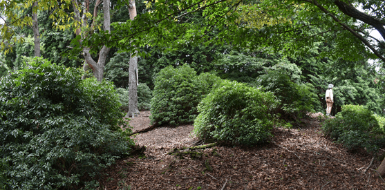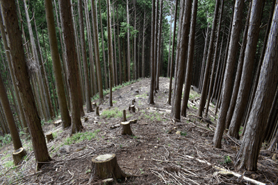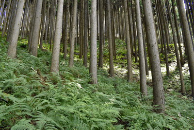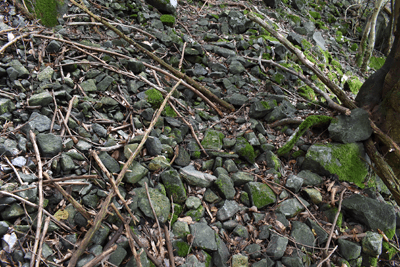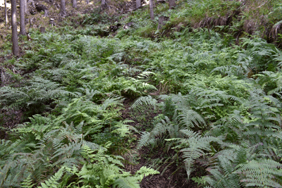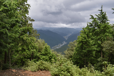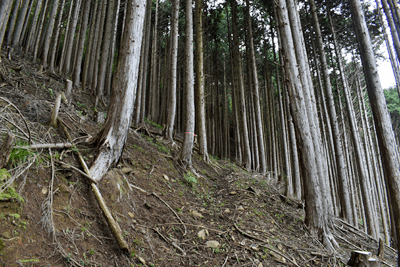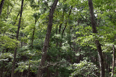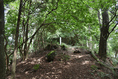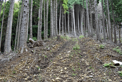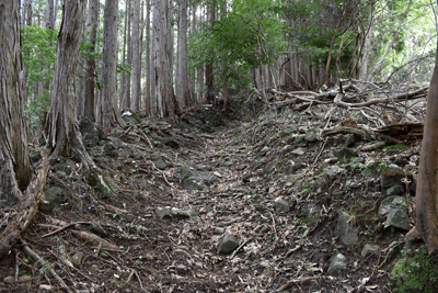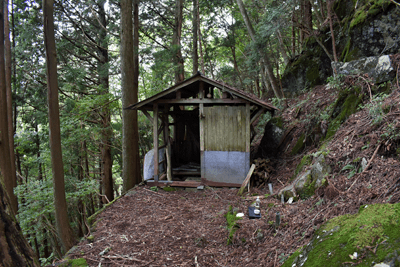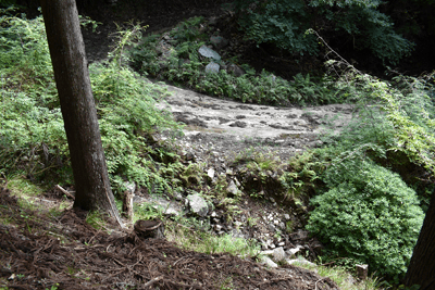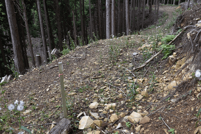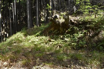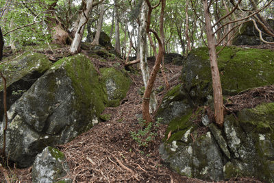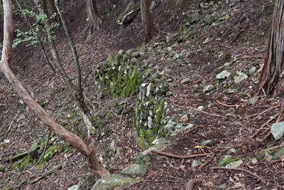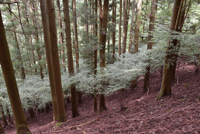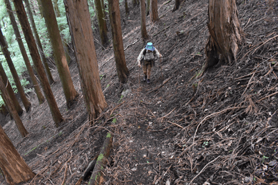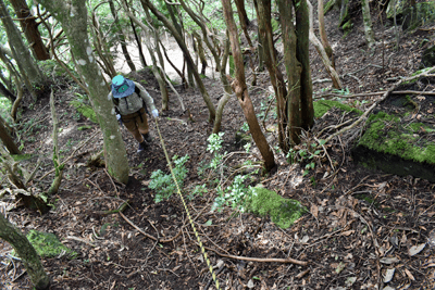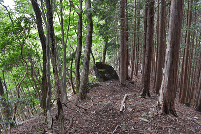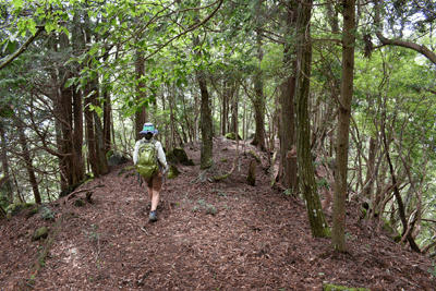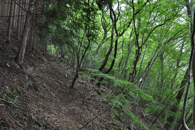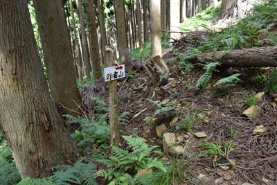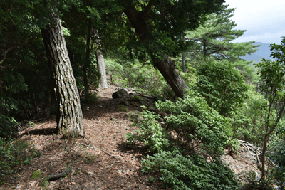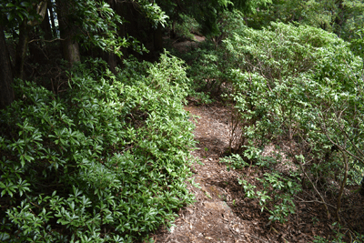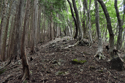 | 5年ぶりの生栖行者山は、また五合目登山口からのコースを登ることにした。向かったのは2025年9月の第三金曜日のこと。長かった夏の暑さは漸く影を潜めて、この日は麓でも涼しさがあった。五合目はお堂があり、休み堂も建っていた。その前は小さな境内になっており、そこに車を止めて登山口に入った。始めは真っ直ぐ南東へと登って行く。シダが増えており、以前と比べて少し歩き難くなってきたように思えた。表土が流されたのか小石も増えていた。作業道に出会うと標識があり、作業道を横切ることになった。辺りはすっかり植林地だった。その後も何度も作業道と出会った。その都度標識があり、作業道を横切ったり短い距離だけ作業道を歩いた。漸く登山道をずっと歩くようになったのは標高500m辺りで、周囲はまだ植林地だった。南西尾根に着いて自然林の中を歩くようになった。緩やかな南西尾根を登って行くと、左手に行者堂への小径が分かれた。その行者堂に立ち寄ると、前回に見たときと変わっておらず、ほぼ廃屋状態だった。尾根道に戻るとその先で大岩が現れて、そこは大岩の間に架けられたロープを掴んで登った。大岩を超すと僅かな距離で山名標識が立つ三角点の位置に着いた。三等三角点(点名・生栖)は以前のままに大きく削られた哀れな姿だった。そこより数十メートル先が山頂だった。山頂に着いて漸く北に展望が現れたが、その北の方向は黒々と雨雲が広がっており、多くの山は雲に隠されていた。北風があり、僅かながら雨粒が飛んでくることもあった。風に当たっていると少し肌寒ささえ覚えた。但し上空には青空が見えていた。展望が楽しめないとなると、ただ休むだけだった。アセビ帯のそばで横になって休憩とした。山上の涼しさには爽やかさもあり、良い感じで休むことが出来た。山頂で休んでいたのは40分ほど。下山は往路を戻った。忠実に標識に従って戻ったのだが、一つの標識が山頂方向と下山方向を示す向きが逆になっているのに気付いた。下るほどに歩き難さが出てきたので、左手に林道が見えたときその林道に下りた。後は林道歩きで五合目登山口へと戻ったのだが、GPSで軌跡を見ると、少々大回りをしていた。すんなり登山道を戻った方が良かったようだった。 (2025/10記) |