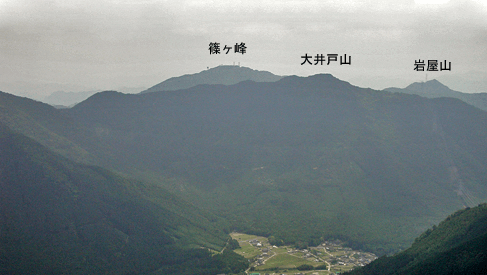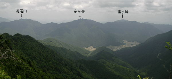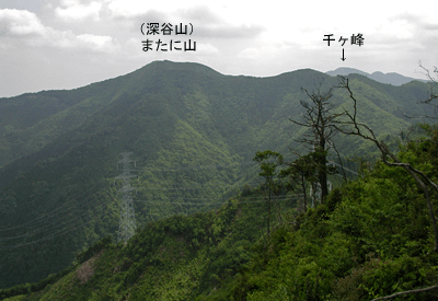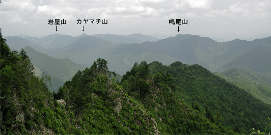 | 神崎町の越知川沿いの道を北へと走って新田集落最奥の「新田ふるさと村」に着くと、その先にあった駐車場に車を止めた。越知川沿いの道は、林道新田黒川線として峠を越して生野町まで続くが、駐車地点から先は通行禁止とされていた。この地域の登山としては2年前に西の尾根から北へと回り、峠を過ぎて次の840mピークまで歩いていた。そのときはその南の鞍部から下山していたので、今回はその続きとして尾根を更に南へと縦走して、幾つか有る800m台のピークを目指すことにした。 立派な舗装路の林道を40分ほど歩いて分岐点に着くと、右手の道に入った。沢沿いの細い未舗装路だった。沢が二手に分かれる所に小橋があり、それを渡ると道は次第に細くなってきた。雑草も多くなり荒れてきた。時に道が分かり難い所も現れた。その頃になって前回の下山ルートを外れていることを確信したが、沢沿いに小道が続く限りはそれを辿ることにした。傾斜はそほどきつくはならなかったが、雑草のはびこりがひどく、ときに胸までの草を押しのけながら進むこともあった。沢の奥詰まりが近くなる頃、道が判然としなくなったので、沢で小休止の後、その先の斜面を適当に登ることにした。するとなぜかそこには山道が付いており、自然と尾根を登ることになった。あまり高い木が見られない尾根で、登るほどに周囲を眺められるようになった。その尾根も次第に灌木が増えてきて、登り難くなった。おまけにサルトリイバラも多かった。その尾根はあまり風が来ず、気温が高めだったこともあって大汗をかいての登りだった。尾根を登り詰めた所が800mピークだったが、山名表示板があって「北雄岳」とされていた。またこのピークを通る稜線を千ヶ峰−三国岳縦走路と名付けていた。その800mピークは展望が良いとは言えず、すぐに南へと次のピークを目指した。縦走路と名付けているだけに尾根は灌木や下生えが刈られており、スムーズに歩けた。次の846mピークには「奥雄岳」の名が付いていた。先ほどの山名と言い、どうも新たに命名したようで、土地の臭いがしない空々しい名前に思えた。ちなみに次の850mピークは西雄岳と、また前回に登った北の840mピークは「槍ヶ峰」と名付けられていた。どうも北アルプスを模したパロディで、滑稽としか思えなかった。846mピークで昼食とした。その846mピークは素晴らしい展望地だった。まず南東に位置する竜ヶ岳から篠ヶ峰へと続く尾根が目に飛び込んできた。北はこのピークから続く尾根が広く眺められる。そして南西には大きくまたに山が対峙しており、千ヶ峰の山頂部がその背後にちらりと見えていた。ただ展望が良いだけに陽射しも強く受けることになり、風が止まるとすっかり夏の暑さだった。早々と日陰に退散して昼寝を決め込んだ。一休みの後は850mピークに向かった。雑木が少なく展望の良い尾根が続いたが、何とも陽射しがまぶしかった。程なく着いた850mピークも展望は良かった。北側の展望が更に良く、青倉山から粟鹿山、そしてカヤマチ山の山並みを見渡せた。ところで千ヶ峰から続くこの尾根を、ピークに立つ標識では「加美アルプス」と名付けていた。850mピークからは縦走路を千ヶ峰方向に向かった。よく整備された道だった。山腹を巻くような所では、鉄製の橋も置かれていた。暫く進むとほぼ平坦な尾根が主尾根から北西に向かって分岐しており、その方向が駐車地点だった。そこでその支尾根を下って下山することにした。その支尾根が荒れ道だった。尾根は手入れの悪い植林地でしかも灌木も茂っており、枝をかき分けないと進めなかった。平坦な所が終わると西に展望が広がり、遠くは高畑山が望めた。後は南西方向に延びる急尾根を下った。その北斜面は植林帯で南斜面は雑木帯になっていた。尾根には防鹿ネットが張られていたので、ネット沿いにぐんぐん下った。その経路の途中に三角点があるはずだったが、その付近は雑草が茂っており地表が見定め難かった。結局、三角点は見つからず。代わりに若いワラビを多く見かけたので、暫しワラビ採りをした。その尾根を下りきると、越知川を渡って林道に出た。林道を20分ほど歩いて駐車地点に戻ってきた。 ※西雄岳と名付けられた850mピークは、多田繁次氏の「続兵庫の山やま」の中で、「またに山」の項にある地図に「ふたご山」の名が付けられていた。846mピークと併せての山名ではと思われた。 ※奥雄岳と名付けられた846mピークは、2002年に四等三角点(点名・小屋ヶ谷)が設置されており、標高は842mに変更されていた。 (2001/8記)(2010/9改訂)(2026/1写真改訂) |