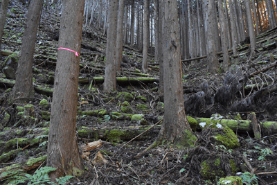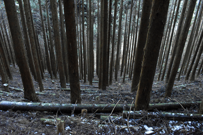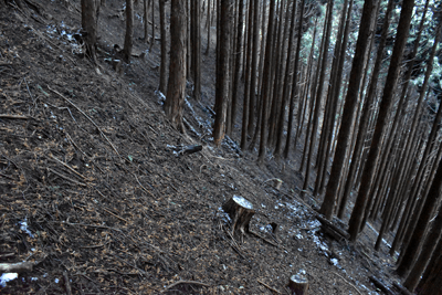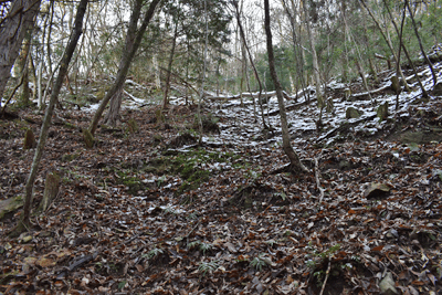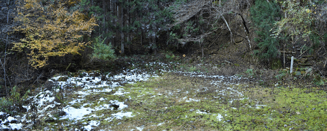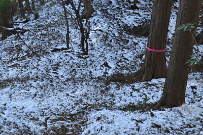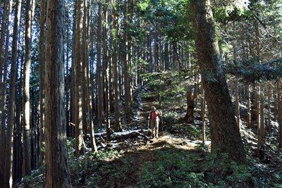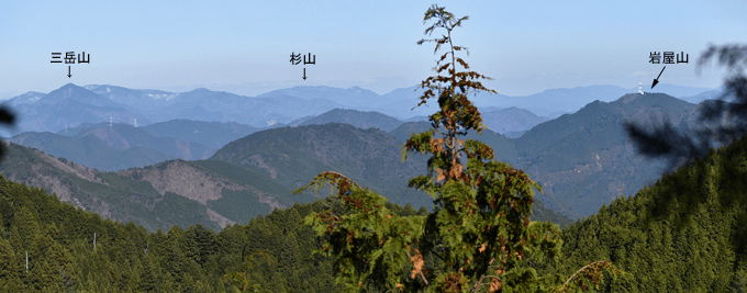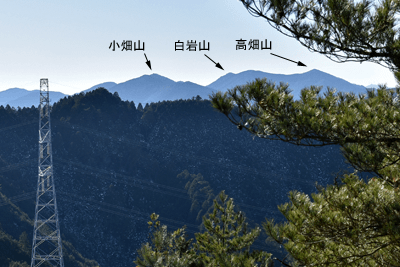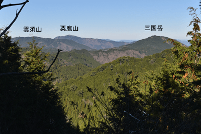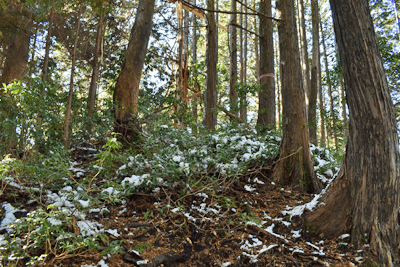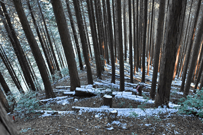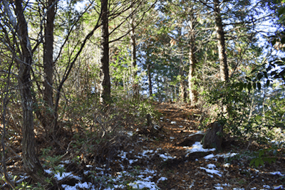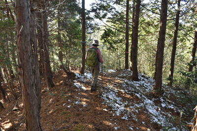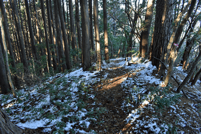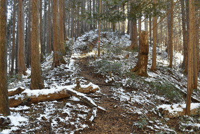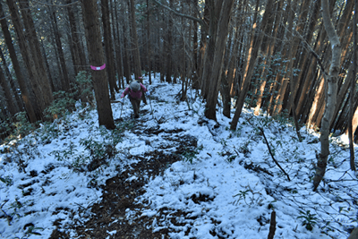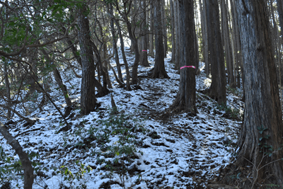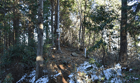 | 兵庫もアルプスの名が付く岩尾根が幾つかあるが、どうも加美アルプスはアルプスらしさが今一つに思えて、2001年に登ってから足が遠のいていた。そのアルプスらしさのことは別にして、山頂展望を楽しもうと向かったのは2025年12月の第一土曜日のこと。兵庫は全域で快晴の予想だった。多可町の空も青く澄んでいた。国道427号線を北上して道の駅「杉原紙の里・多可」まで来ると、その前から始まる林道に入った。暫く進んで林道の分岐点が現れると、そこは三国岳コースの登山口の位置で、数台の車が止まっていた。三国岳への林道とは別の林道を進むとダート道となり、その林道も二手に分かれた。そこまでの林道が少し走り難さがあったことでもあり、分岐点近くに車を止めると右手の道を歩き始めた。前日にでも降ったのか、道そばに雪を見ることがあった。ほぼ緩やかな林道を10分ほど歩くと、林道は終点となった。そこに立つ標柱で、林道は奥小山支線であることを知った。地図では終点位置から真っ直ぐ西へと町境尾根まで破線路が描かれていた。その終点位置からそれらしき道が始まっており、その小径に入ったところすぐに荒れてきた。そして道自体が不確かになったため、適当に歩くことになった。しかも斜面は一面うっすらと雪が積もっていた。ピンクテープがあり、それを追うと知らぬ間に破線路コースを離れて、一つ南隣の尾根に近づいていた。そのまま南の尾根に上がって、尾根歩きで町境尾根を目指した。その尾根がけっこう急傾斜だった。しかも雪で滑り易くなっており、慎重にも慎重を重ねて尾根を登った。何とか町境尾根に出るも、林道終点からは1時間が経っていた。下山では歩きたくない尾根だと思った。境界尾根は加美アルプスの縦走路であり、そこもすっかり雪に覆われていた。但しうっすらとした雪で、陽射しを受ければ数日で消えそうだった。奥雄岳を目指して南へと尾根歩きを開始した。小さなピークを越して行くが、尾根歩きとしては易しかった。雪の尾根を歩く雰囲気も悪くなかった。すぐに現れたのは北雄岳の分岐点だった。縦走コースを離れて北雄岳への小径に入ると、僅かな距離で北雄岳の山頂に着いた。標高800mの北雄岳は樹林に囲まれており、展望は無かった。すぐに引き返して縦走路に戻った。南へと歩いて行く。小さなピークがあり、そこには涸沢山の名が付いていた。まさに北アルプスのパロディだと思った。そのことは気にせず、尾根歩きを続けた。はっきりと上り坂になり、平坦となって今少し歩いた位置が奥雄岳のピークだった。そこに四等三角点(点名・小屋ヶ谷)を見たが、そこも北雄岳と同様に樹林に囲まれていた。その奥雄岳で昼食タイムとしたが、山頂ではなく今少し南へと歩いて開けている所を求めた。そこはすぐに現れて、展望地でもあった。南向かいの深谷山が大きく眺められ、東には竜ヶ岳と大井戸山の並ぶ姿を見た。そこまでの尾根歩きでは樹林の中を歩くとあって陽射しを受けなかったため、5℃まで冷えていたが、その展望地は陽射しも受けており、10℃まで気温は上がっていた。風が無いため、快い暖かさだった。その奥雄岳の展望地で40分ばかり休んだため、13時を回って漸く西雄岳に向かうことになった。30メートルほど下って40メートルほどの登り返しだった。その道中でも所々で展望を楽しめた。西雄岳の山頂に着くと、そこはごく狭く展望は無かった。西雄岳からは深谷山、千ヶ峰へと縦走路は続くのだが、歩くのは西雄岳までとして引き返した。奥雄岳に戻ってきたときは、14時が近い時間になっていた。冬至が近くなっており、暗さが出ないうちに下山を終えたかったが、奥雄岳からちらりと但馬の妙見山が見えることに気付いた。そこで他の山も見えるのではと探ると、木々の隙間から蘇武岳も氷ノ山も眺められることになった。その展望を探っていたことで、14時までの休憩になっていた。急いで下山に移った。北へと尾根を戻って行く。概ね易しい尾根が続くとあって休まず歩くと、往路の合流点まで20分だった。そこから尾根を離れる気は無く、地図の破線路を下ることにした。その破線コースの分岐点となる尾根の鞍部まで更に10分ほど歩いた。鞍部に着くも赤テープを見るだけで、標識は無かった。また破線路らしき小径も見えなかった。そこで適当に斜面を下ることにした。当然歩き易い所を探りながらだったが、植林地の斜面は小石が多く、また間伐された倒木も多かった。それが雪に隠されており、けっこう難儀な下りだった。ときおり赤テープを見るも、GPSを見て破線路から大きく離れないように下った。その下りを続けるうちに往路コースに合流し、無事林道の終点位置に戻ってきた。急斜面を下ったため、境界尾根を離れてから40分程で戻ってきており、往路コースよりもずいぶん早く戻ってきたようだった。まだ15時を少し過ぎた時間とあって、焦りの気持ちを持つことも無く駐車地点へと戻って行