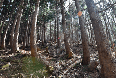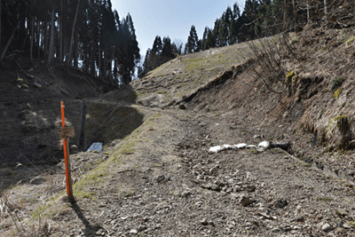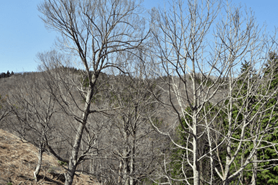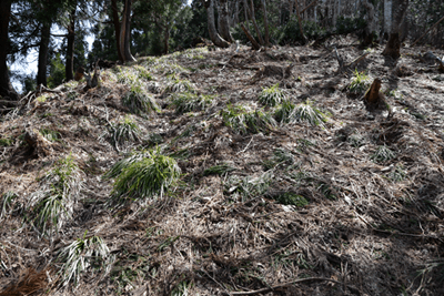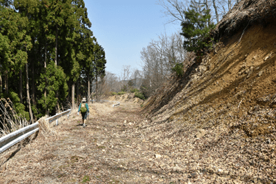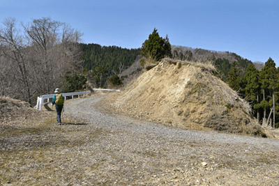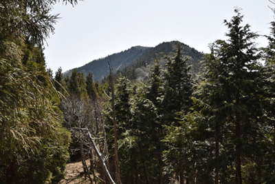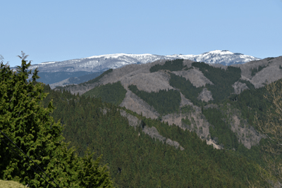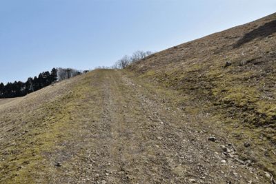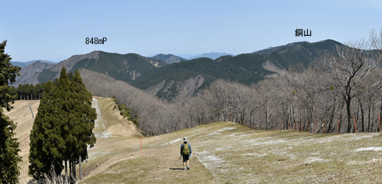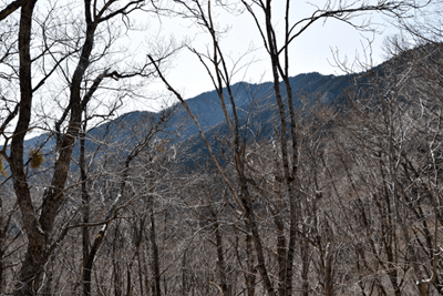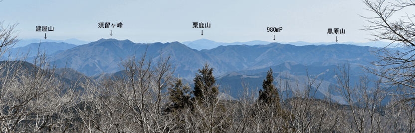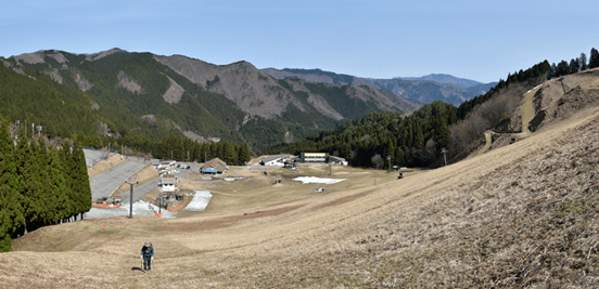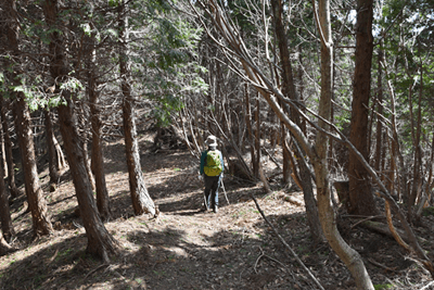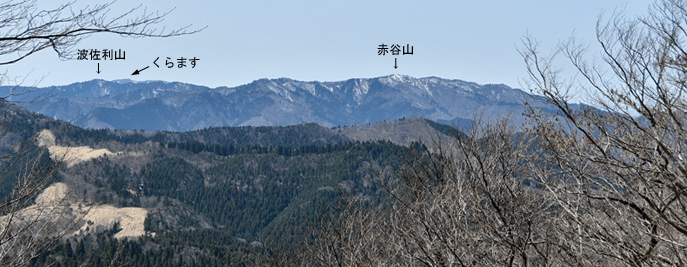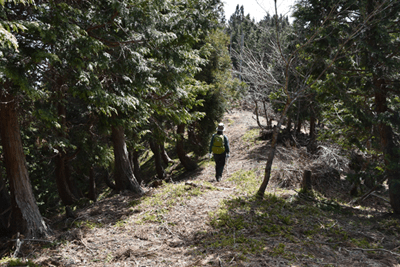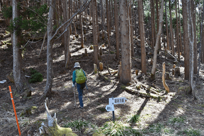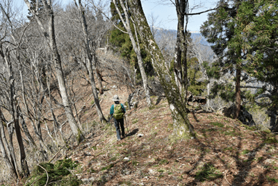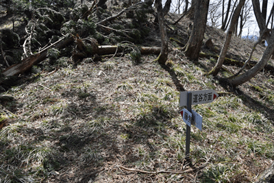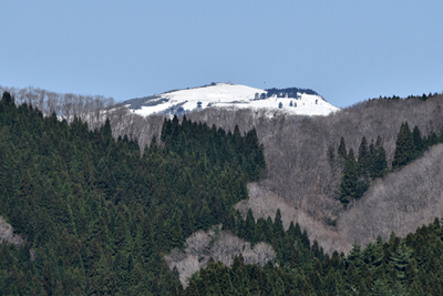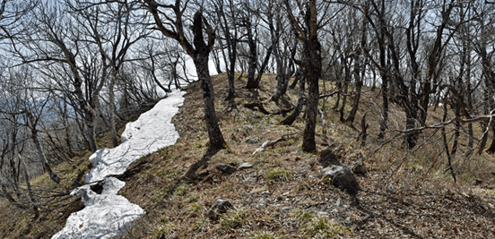 | 藤無山を北面側にある大屋スキー場から登ろうと向かったのは、2018年3月の最終日だった。大屋スキー場から登るのは8年ぶりだった。スキー場は3月始めに営業を終えていたが、駐車場には10台ほどの車が止まっていた。どうやらメンテナンス関係の車のようだった。スキー場のゲレンデには雪はほとんど無く、雪を気にせず登山が出来そうだった。まずはゲレンデを登って行く。けっこう急斜面とあって良い運動だった。登るほどに後方に展望が広がって、但馬の妙見山の姿が眺められるようになった。ゲレンデ野最上部まで来ると、白い氷ノ山の頂がちらりと見えるようになった。リフト頂上駅まで来ると、そこより林道歩きだった。斜面に無理やり作った感のある林道は崩壊が目立った。もう車の通行は無理なようだった。尾根と接する位置まで来ると登山口標識が現れて、そこからは植林地の斜面に取り付いて尾根歩きに移った。尾根を歩くようになって強い西風を受けるようになったが、風の冷たさは冬の名残があった。周囲は植林地だったり雑木だったりで、雑木はどの木も葉を落とした姿で、その木々の空いた所からときおり赤谷山や尾根続きの三久安山が望まれた。尾根は小さなアップダウンはあるものの急傾斜は無く歩くのは楽だったが、風は衰えることは無くその冷たさが身に凍みた。山頂が近くなると左手に展望が現れて、氷ノ山から妙見山までがすっきりと眺められることがあった。山頂に着いたのは駐車場から一時間半後、登山口に入ってから54分後で、特に厳しい所も無いまま着くことになった。山頂は三角点を中心に開けていたが、やはり風が冷たかった。そこで風を避けられる東斜面に入って、そちらで昼休憩とした。山頂ではその東斜面側にだけ展望があって、須留ヶ峰から生野高原までの尾根が前方に広がっていた。その風景を眺めながら昼休憩とした。藤無山を久し振りに登っての印象としては、山の木々は冬姿であり風もまだまだ冷たかったとあって、登山を楽しむには季節外れに登ってしまったとの思いだった。山頂で30分ばかりの休憩をとった後は、すんなりと往路を戻っての下山とした。下山時は昼の時間となっていたので、風の冷たさは幾分和らいでいた。緩やかな尾根は下山ではいっそうの易しさで、ごく気楽な下りだった。一時間も下ればスキー場のリフト頂上駅まで戻ってきた。後は雪の無いゲレンデをきままに下って行くだけだった。 (2018/4記)(2020/3改訂)(2025/12写真改訂) |