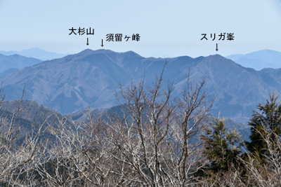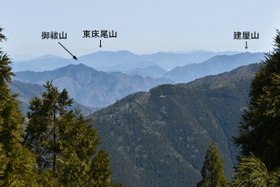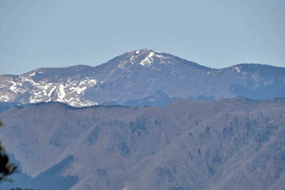 | (天気) | 快晴。薄青空ながら雲は見られなかった。尾根の気温は13℃で、西風がけっこう冷たかった。山頂は陽射しに包まれており、20℃近くあった。視界は白っぽいながら、まずまず良かった。 | ||