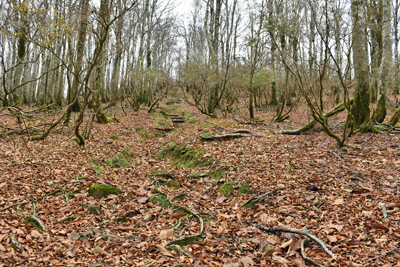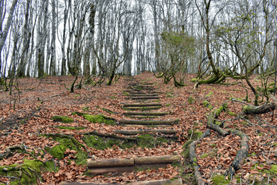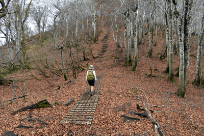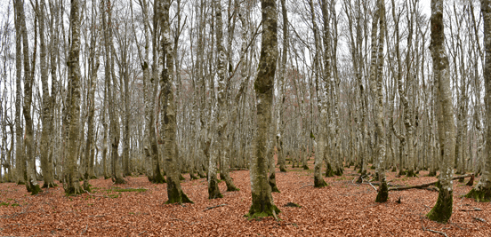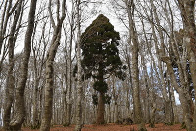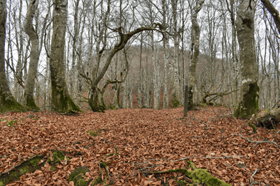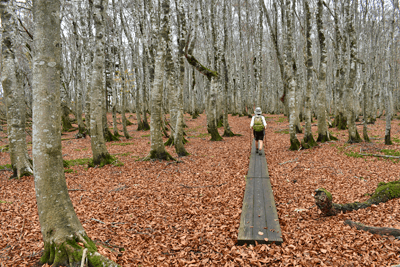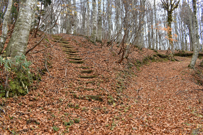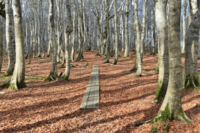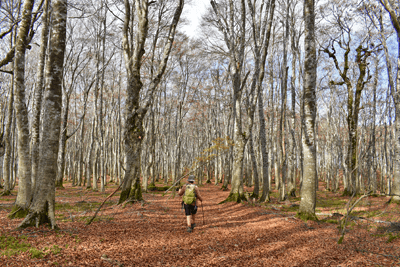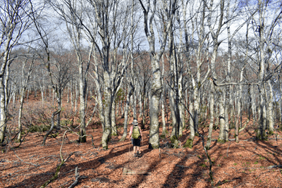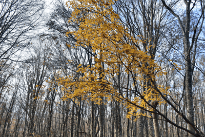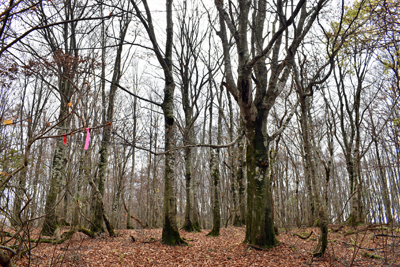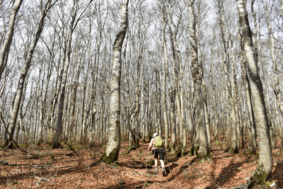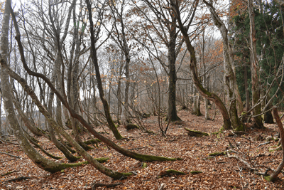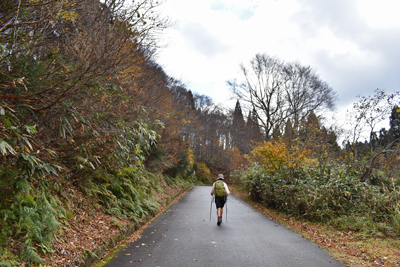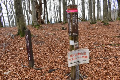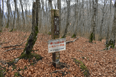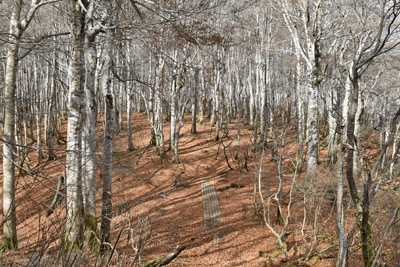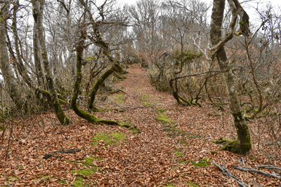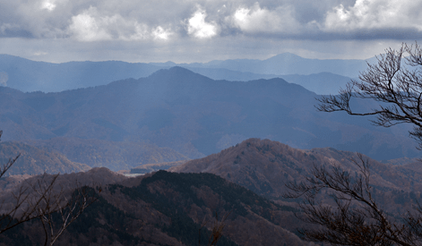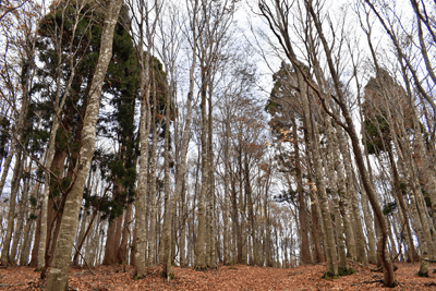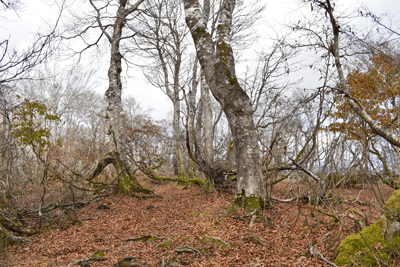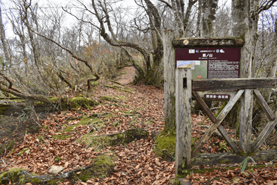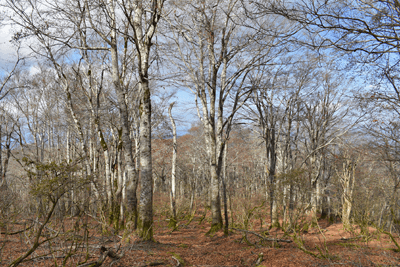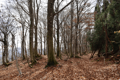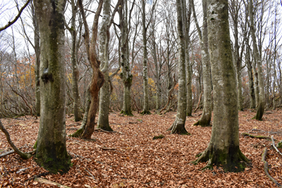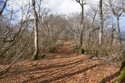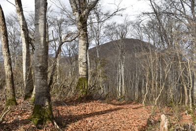 | 扇ノ山を易しい登山道が続く小ズッコ小屋コースで登ることにした。理由は易しく歩けることではなく、ブナ林の美しさを一番楽しめるコースではと思えてだった。向かったのは2025年11月の第三土曜日のこと。まずは上山高原を目指すのだが、ナビのセットを誤ってしまい。岸田川沿いの県道を走ってしまった。ずっと沢筋を走ることに疑問を感じて道誤りに気付いて軌道修正したものの、結局上山高原に着くのが半時間以上遅れてしまった。上山高原の上空は雲は多かったが、青空も見えていた。天気予報は晴れだったので、それを信じることにした。小ズッコ小屋コースの登山口は上山高原より今少し走った位置にあり、上山高原一帯の案内板が立っていた。その近くに数台分の駐車スペースがあり、先着の車を1台見た。登山口に入ると始めに階段を登り、道なりに歩いて程なく現れたのが小ズッコ小屋だった。その先は道がはっきりしているとは言えず、目印テープを追うようにして歩いた。標識が現れるとそこは河合谷コースとの合流点で、兵庫鳥取の県境でもあった。そこから山頂までは2.4kmで、ずっと県境の尾根歩きだった。その頃には上空はすっかり曇り空に変わっており、どうも天気予報は違ったようだった。県境尾根はひたすら緩やかだった。そのためまだ目印テープを確認しながら歩いた。周囲はすっかりブナ林になっており、紅葉は終わってほぼ裸木になっていた。そのブナ林の風景を愛でながら歩いて行く。前方に見えてきたピークは大ズッコで、近づくと階段道を登るようになった。大ズッコのピークまで来れば、山頂まで900mだった。扇ノ山山頂が見えると、そこにうっすらガスを見た。それも鞍部へと下るうちにガスは消えてきた。その辺りのブナ林の風景は純林と呼ぶのが相応しく、陽射しの中で眺めたいと思った。そのブナ林に囲まれて山頂に近づいた。山頂が間近になると展望台が現れた。そこからは鳥取市街の方向が眺められるのだが、うっすらとした視界だった。山頂に着いたのは12時前。小ズッコ小屋から76分が経っていた。山頂で休んでいた先着者は数名。山頂に来るまでにも10人ほどを見ていたので、扇ノ山はなかなか人気の山ではと思えた。その山頂はどんより曇り空だったが、意外と視界は良く、氷ノ山がはっきり見えていた。その氷ノ山の尾根には陽射しが当たっていた。北の空を見ると青空が見えたので、これは天気が良くなりそうに思えた。その通りで、山頂で休むうちに徐々に青空が頭上まで現れた。陽射しも現れて、雲は多いものの晴れと呼べるまでになった。山頂で休んでいたのは1時間ほど。下山は往路をひたすら戻るのみ。往路はずっと薄暗いブナ林を見ていたのだが、今度は明るいブナ林を眺めながらとなった。考えてみると、登山口に着くのが1時間遅れてこその好天との出会いとなり、うれしい誤算だった。何度かブナ林の風景に足を止めたので、この下山は往路よりも時間がかかることになったが、易しいハイキングなので気にならず、じっくり歩くことをひたすら楽しんだ。登山口に戻って来ると、ススキの風景が続く上山高原を通って戻るのだが、その空はすっかり快晴になっていた。 (2025/12記) |