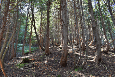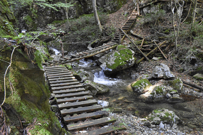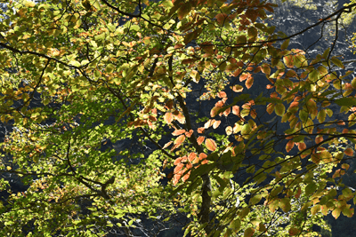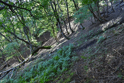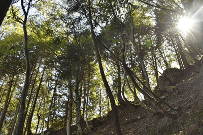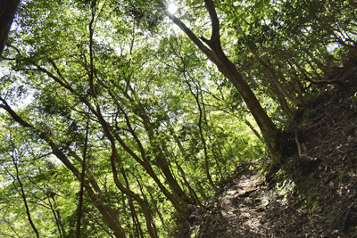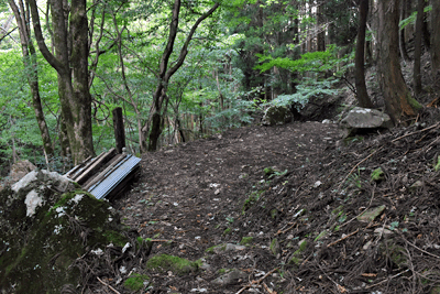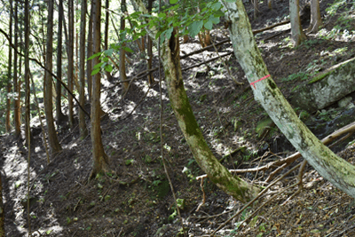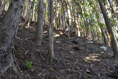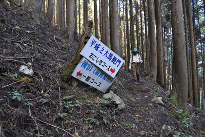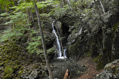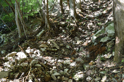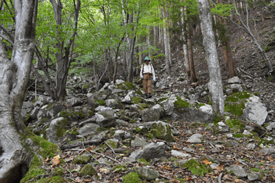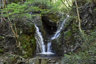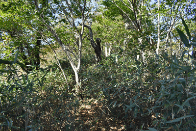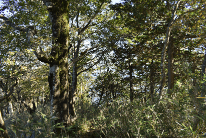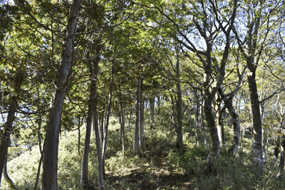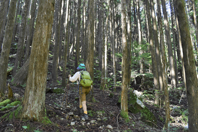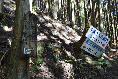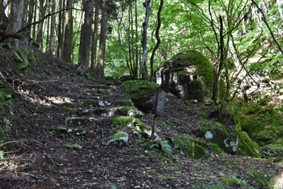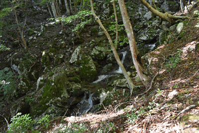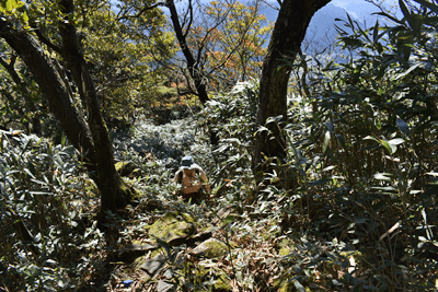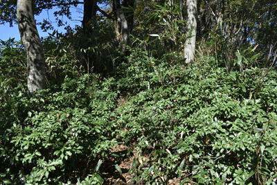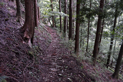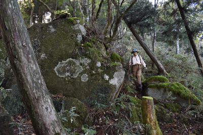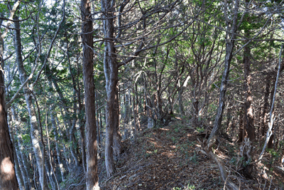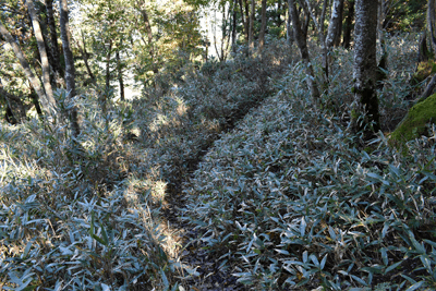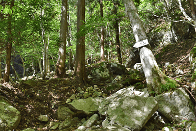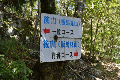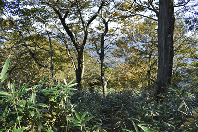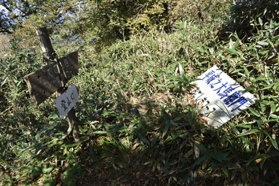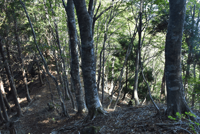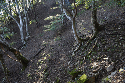 | 後山を河久保林道の終点から始まる登山コースで登ろうと向かったのは、2025年10月の第三金曜日のこと。久々に走る河久保林道は荒れが進んでいた。更に途中からは通行止めになっていた。禁止の理由が書かれておらず、崩壊地でもあるのかとそのまま進むと、路肩の崩れている所が現れた。小さな車には問題無さそうだったのでそのまま進むと、少し悪路の部分はあったが無事林道終点の広場に着くことが出来た。この日はずっと一般コースを登る予定だった。登山口に入ると、ひんやりとした空気感の下を登って行く。二の沢小屋の中を通過すると、次は「宿坊跡」に建つ避難小屋の中を通るのだが、その避難小屋が無くなっていた。老朽化で取り壊されたようだった。不動の滝を左手に見ながら小橋を渡ると、沢の左岸側を進んだ。金掛の行場、石小屋の不動尊のそばを過ぎると、おごしき山コースが右手に分岐した。そちらは下山コースと考えていた。一般コースを進むとガレ場を歩く感じとなったり、沢を歩いたりと少々歩き難さが続いた。コースもはっきりしていない所があり、目印テープを見落とさないように前方を慎重に見極めた。行者コースも分岐点が現れても、進む方向は一般コースだった。植林地の斜面をつづら折れで登って南の方向に向かった。小さな尾根に出て、その尾根を辿った先で漸く笛石山コースと合流した。ゆったりとした尾根道を歩くようになり、程なく県境尾根に合流した。1253mピークの手前だった。そこより進む方向は北となった。県境尾根はクマザサが茂っており、ときにかき分けて進むこともあった。山頂が見えると、まだ距離はあると思った。右手から行者コースが合流すると、そこより更に十数分歩いて山頂に到着した。直前までクマザサ帯が続いたので、山頂に着いたときはほっとする思いだった。山頂の気温は16℃。漸く秋らしい空気感の中で憩える季節になったと思った。その山頂は5年前の前回とあまり変わっていなかったが、幾分三室山が良く見えるようになっていた。この日の視界は澄んでおり、くっきりとした視界で眺められたのは良かった。山頂で昼食を済ませるなどひとときを過ごすと、下山に移った。下山は予定通りおごしき山コースに入った。始めこそクマザサが茂っていたが、下るうちにクマザサは減ってスムーズに歩けるようになった。後山の一般コースよりも歩き易いと言えた。おごしき山に着いたときは、後山山頂を離れてから40分が経っていた。直前まで樹林帯を歩いていたので、いきなりと言った感じで「平成の大馬鹿門」との対面となった。そのおごしき山は残念なことにすっかり展望が悪くなっていた。周囲の木々が生長したためだった。おごしき山を離れると、少し尾根を辿った後、南斜面に入った。緩やかに南西方向へとトラバースした。道が細々としている所もあって、足下には注意を要した。ただ荒れ道でも無くヤブでも無かったので、その点は良かった。トラバースは長く続き、後山一般コースに合流するまで40近くを要した。一般コースに合流すると、後は往路で歩いた道を戻るのみ。合流点から暫く歩き難い道が続き、それが無くなると不動の滝は近かった。滝を見ながら小橋を渡ると、もう易しい登山道となって登山口に近づいた。 (2025/11記) |