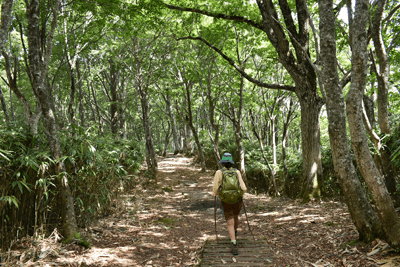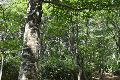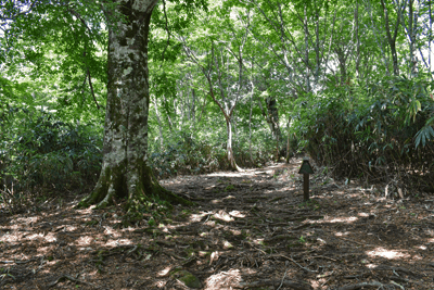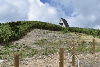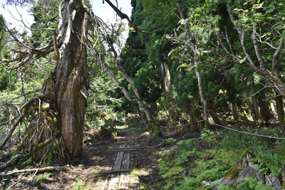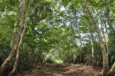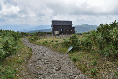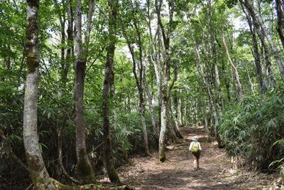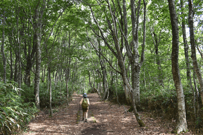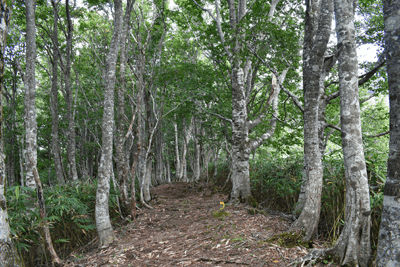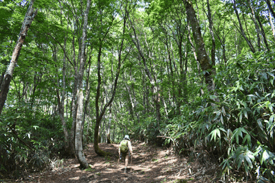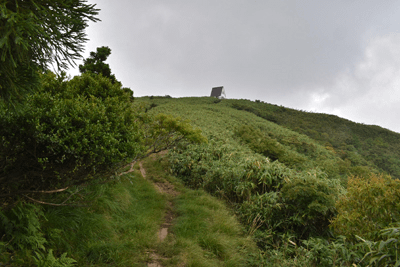 8月は当然暑い日が続くが、その中でここなら涼しいだろうとの考えで氷ノ山に向かったのは2025年8月のお盆休暇中の一日、15日のことだった。夏場なので短時間で山頂に立とうと、大段ヶ平コースを登ることにした。 横行林道を走って大段ヶ平の駐車場に着いたのは10時前だった。いつもながら数台の車が止まっていた。氷ノ山を見るとその上空は雲が広がっていたが、曇りと言うほどではなく、雲の多い晴れと言えそうだった。駐車場の気温は27℃ほどで、あまり暑さは感じなかった。これなら山頂での涼しさを期待出来そうだった。登山口を通って自然林の樹林帯に入ると、気温は26℃となり涼しい風を受けるようになった。森の散策をしている雰囲気だった。緩やかな上り坂が続くうちに樹林は減って、周囲にネマガリダケが増えてきた。上空の雲は次第に減って、青空が広がろうとしていた。そうなると陽射しを受けながらの登りが増えてきた。樹林に囲まれることはあったが、陽射しを受けている方が多かった。大屋町***避難小屋までは順調だったが、神大ヒュッテが近づく頃にははやバテ気味になってきた。そこで神大ヒュッテの前で小休止としたが、なかなかバテ気味の体は元に戻らなかった。神大ヒュッテを離れても陽射しを受けることが多かった。夏場の登山をして大段ヶ平コースは、登山時間は短くても陽射しを受けることがけっこう多いことが分かった。千本杉の木陰で一休み、古千本杉でも一休みと、休み休みの登山になってしまった。それでも山頂避難小屋が見えて来ると少しは元気が戻って、後は休まず歩いて山頂に到着した。その山頂が予想以上に涼しかった。小屋に入ると気温は22℃だった。窓は開かれており、涼しいばかりの風は爽やかそのもので、まさに極上の涼しさだった。小屋の外も同様で、夏の氷ノ山は兵庫の山では別格の涼しさだと改めて認識した。この日の視界はうっすらしていたこともあり、ひたすら風の涼しさを楽しんだ。ところで山頂そばのもう一つの避難小屋に立ち寄ってみると、入口は施錠されておらず中に入ることが出来た。ただ中の空気は淀んでおり蒸し暑さも感じた。すぐに山頂へと引き返した。山頂は常に10人前後のハイカーがおり、まずまずの賑わいだった。そのハイカーに混じって山頂では80分ほど過ごした。下山は往路を戻るのみ。昼を回っても山頂の涼しさは続いていたが、登山道を下り出すと、そちらの空気ははっきり生暖かさを感じた。それでも下る方向なので、暑さは感じるもののバテ気味になることは無かった。ただ陽射しを受けながらとあって大汗をかきながらだった。下山でも神大ヒュッテで小休止をとり、後は休まず歩いた。大屋町避難小屋を過ぎるとほぼ木陰の自然林となり、その美しさを愛でながら散策間隔で登山口へと戻って行った。 (2025/8記) |