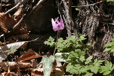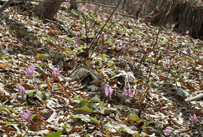 分県登山ガイドの「宮城県の山」を開いて、仙台市街に近い手頃な里山は無いかと眺めていると、七ツ岳の写真が目を惹いた。小さな山を幾つも並べたその姿は、本に書かれている表現通り、昔話に出てくるようなほのぼのとした暖かみがあった。但し登るとなると時間をかけてこそ面白いようだった。そこでこの七ツ岳を眺める山も良いのではと考えて注目したのが、この笹倉山だった。山上からすっきりと七ツ岳の姿を目に出来そうだった。これを考えていたのは2006年4月23日の昼前のことで、この日は出張先の仙台市で休日になっており、好天の下で泉ヶ岳から下山してきた後だった。せっかくの宮城の休日を一つの山だけではもったいないと、午後にもう一山登ろうとの考えからだった。笹倉山は泉ヶ岳からも近く、移動の時間が少なくて済みそうなのも助かった。ただレンタカーのナビをどこに設定するかで迷った。とりあえず七ツ森湖を目指すことにした。その七ツ森湖に着いてみると、湖畔の公園に多くの家族連れが集まって賑わっていた。その湖畔から南の方向を見ると、これから向かう笹倉山が堂々とした山容で迫っていた。その笹倉山への道はナビでは分からず、道路地図も持っていなかったため、ガイド本の概略図で目指すしかなかった。どうも今立っている湖畔から行けそうに思えて、適当に笹倉山の北側を目指すと、笹倉山登山口を示す標識の立っている林道にうまく出会えた。もうその林道を走るだけだった。着いた所が七薬師掛コースの登山口で、その前には20台分ぐらいの駐車場もあった。泉ヶ岳の麓から、ほぼ1時間での移動だった。この午後に入って快晴だった空は、薄晴れの空に変わってきていた。その登山口には、入口になぜか普通の家で見かける門柱が立っており、そこから境内へ行くような感じで石段が始まっていた。周囲は鬱蒼と杉林になっていた。石段はすぐに土道に変わって、緩やかに奥へと続いていた。その薄暗い雰囲気が変わったのは、登山道の斜度が増した辺りからで、周囲は雑木林に変わってきた。そして路傍に紫の花が見られるようになった。カタクリの花だった。別に群落にはなっておらず、ぽつぽつと咲いていた。ややきつい坂のためか、登山道には手摺りが付けられていた。その急坂を登って、北東から来る尾根に出た。その尾根を右手に行けば眺子ノ口展望台に向かうことになるが、それは下山時として、まずは左手へと山頂を目指した。亀ノ子岩のそばを通り、ごく普通の山道の雰囲気で登山道は続いていた。程なく道はつづら折れとなって急斜面を登るようになった。登るにつれてカタクリの花は増えて来た。白い花も見かけるようになったが、どうやらニリンソウのように見えた。そこを登り詰めると、国見崎展望台がそばにあった。小さな東屋が置かれており、一休みすることにした。そこからは東の方向が開けており、広々とした平野が海まで続いているのが眺められた。但し、視界は薄モヤがかっており、すっきりとした見え方では無かった。北東方向も見えており、希望していた七ツ岳の並ぶ様が眺められたのは良かった。もうそこから山頂までは数分の距離で、道も緩やかなものだった。また参道のような雰囲気になっていた。程なく着いた山頂は中央に薬師堂があり、そのそばに緑に塗られたトタンで囲まれた小屋風の建物があった。そこを貧弱な植林が取り囲んでいた。いわゆるお社の山で、展望は無かった。少しお堂の裏手に回ってみると、そこは疎らな雑木林で、その地表にカタクリの花がいっぱい咲いていた。油断すると踏みそうになるぐらいだった。いかにも春の山にいることを実感させる眺めだった。山頂の雰囲気が分かったところで、引き返すことにした。往路をすんなりと引き返したが、この下山時には眺子ノ口展望台に立ち寄った。登山道の分岐点から数十メートル歩くだけだったが、その展望地には国見崎展望台のような東屋は無く、ただ展望が良いと言うだけだった。分県登山ガイドでは、展望台から写された七ツ岳の写真が載っていたが、樹木が育ったためか、その写真のようには七ツ岳は見えず、七ツ森湖周辺のみがすっきりと望まれた。この後は下山を続けて、14時過ぎに登山口に戻り着いた。この笹倉山登山は、登山道がよく整備されていただけに、ごく気楽に登ることが出来、またカタクリの花とも出会えて季節感も味わえて、短時間ながら気持ちの良いハイキングを楽しめた。なお午後の登山とあって、山中では下山時に女性の二人連れに出会っただけだった。 (2006/5記)(2021/12改訂)(2025/9写真改訂) |