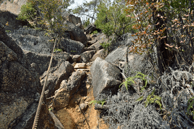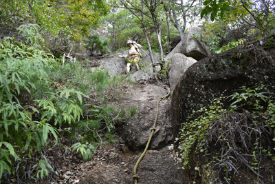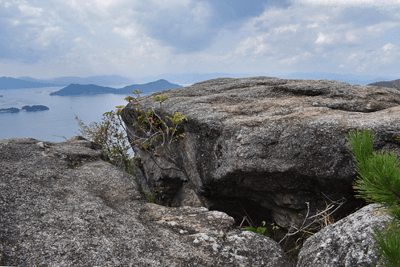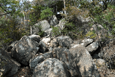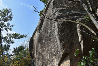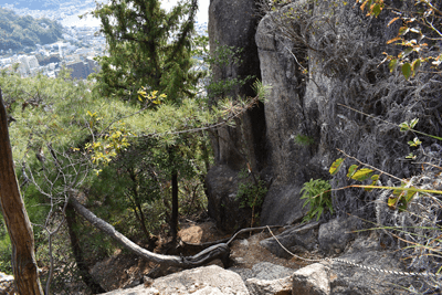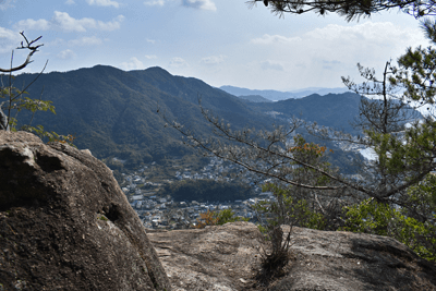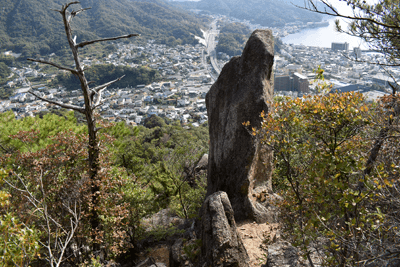 | 呉市近郊の山を登ろうと小旅行に出かけたのは2025年11月初日のこと。この日の午前は移動で、午後だけで楽しめる山として選んだのは呉市の北西端、坂町との境界に近い位置にある近い天狗城山だった。海岸線に近く、海岸との距離は700mほどだった。 8時過ぎに山陽道の姫路西ICに入ると、高速道はスムーズで、高屋JCTで東広島呉自動車道に入った。その後も順調に走って、天狗城山の南麓側にある呉ポートピアパークには11時を過ぎての到着となった。おかげで午前中にスタート出来ることになった。呉ポートピアパークの駐車場には多くの車が止まっていたが、500台分の駐車スペースがあるため、余裕で駐車出来ることになった。ちなみに駐車料金は無料だった。駐車場を離れると、国道31号線の歩道を東へと歩いた。国道はJR呉線と平行しており、呉線の踏切が現れると国道を横切って踏切を渡った。更に北へと向かうと、広島呉道路の高架下を通った。通った先で現れたのは、天狗城山の案内板だった。近くに階段が見えており、その階段の入口が登山口だった。階段は長々と続いており、50メートルほど登って登山道に入った。緩やかな登山道はすぐに終わって、急坂登りが始まった。岩場が点々と現れて、岩場登りとも言えそうだった。岩場にはロープの付いている所も多くあり、少し険しさのあるコースだった。ひたすら目印を追って、コースを外さないように登った。登るほどに背後に展望が広がった。展望岩が多くあり、その上に立つと足下には呉市天応町の町並みを、西は海を挟んで江田島が大きかった。その岩場の多い登りは、とうとう山頂手前まで続いた。山頂は樹林が茂っており展望は無し。ぽつんと四等三角点(点名・天狗城山)を見るだけだった。その山頂手前にも展望岩(蛙岩)があったので、そちらに移動して昼休憩とした。広々とした一枚岩の上は天狗城山で一番の展望地と言えそうで、南東に烏帽子岩山を、西に江田島、そして北は天狗岩の尾根と、遮るものの無い展望を楽しめた。その岩場での休憩を終えると山頂に戻り、今少し北へと歩いた。山頂の樹林帯を抜けると、今度は北東の風景が現れた。そちらにも展望の岩棚があり、先ほどの蛙岩と合わせると、360度の展望となった。前方に見えていたのは次のピーク、中天狗だった。そこまで歩く考えも持っていたのだが、360度の展望を楽しんでしまったことで、天狗城山だけで十分に満足出来た思いになってしまった。中天狗は見るだけにとどめて、岩棚での休憩を終えると山頂に戻った。そして下山に向かった。下山は往路を戻るのみ。南斜面の岩場コースを慎重にも慎重に、そしてゆっくりと下った。その頃には上空の雲は増えており、陽射しを受けないままの下りだった。登りではけっこう汗をかいていたのだが、下りでは汗をかくことは無じゃったので、その点は助かった。滑ることも無く無事登山口に着くと、呉ポートピアパークへと戻った。駐車場に戻ってきたときは、14時を過ぎたばかりの時間だった。ホテルに向かうにはまだ早いので、残りの時間は呉ポートピアパークの散策で過ごすことにした。いつしか上空は快晴になっており、パーク内の広場はすっかりファミリーの世界になっていた。そのパーク内は天狗城山の展望地でもあり、天狗城山がすっきりと富士の姿で眺められた。 (2025/12記) |