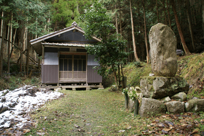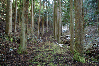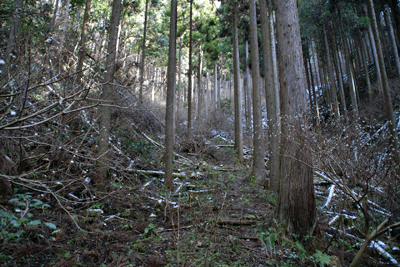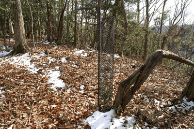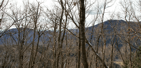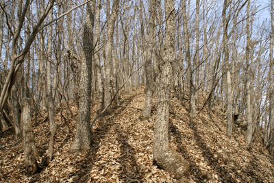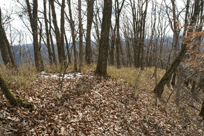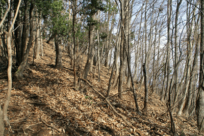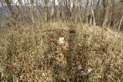 国道373線(智頭街道)を走って兵庫県の佐用町から岡山県に入ると、そこは今は美作市となる旧・大原町の町域だが、地図の「古町」を眺めていると空に関する山名が幾つか散見出来た。星祭山に高照峰、そしてこの大空山である。それだけ空が美しいと言うことだろうか。この三つの山のうちまだ登っていなかったのが大空山で、冬のミニハイキングを楽しもうと軽い気持ちで出かけたのは2008年1月のことだった。地図を見ると西麓の江ノ原集落から破線路が大空山の南を通って東麓の吉田集落へと続いており、どちらから登っても良かったが、単純に幹線側から登ろうと、江ノ原集落から山頂を目指すことにした。 佐用町では現在、中国横断道姫路鳥取線の工事が国道373線に沿って行われているが、その工事は旧・大原町に入っても続いており、市街地を抜けるとその工事が東の山裾で大規模に行われているのが見えた。江ノ原集落に入り地図の破線路を目指すと、それは車1台分の幅しか無い林道で東に延びていた。それを進んで行くと長くは続かず高速道の工事現場で終わっていた。少し引き返し、小さなお堂の近くに駐車とした。破線路のままに歩いて尾根に出る予定で、林道歩きを開始した。高速道の工事はこの日は行われておらず、ひっそりとしていた。左手にトンネルが見えていた。工事現場を越えると再び林道が始まったが、工事で寸断されていることもあり、道には杭が打たれたりして廃道のようになっていた。林道はすぐに細くなり幅広の山道のようになったが、傾斜が増して来ると更に細くなってごく普通の山道へと変わった。周囲は植林地で、進むほどにミツマタの木が多く見られるようになった。どの木もいっぱい蕾を付けていた。また道の上や山肌にちらちらと雪の残っているのが見えた。前日にでも雪が降ったようだった。山道は地図の通りにそのまま尾根に向かって行くものと思っていたのだが、途中から巻き道となって尾根と平行に南に向かい出した。それでは山頂方向とは離れてしまうので、山道を歩くのは止めて尾根に向かって急斜面を一直線に登ることにした。尾根まではすっかり植林地になっており、幹から幹へと伝いながら登って行くと、さほど時間もかからず尾根に出た。その尾根を山頂方向へと北に向かって登った。周囲の木々は植林から落ち着きのある雑木林の風景へと変わってきた。コナラなど落葉樹が主体とあってどの木も裸木になっており、明るい尾根だった。その木々を通して左手には星祭山から高照峰へと続く尾根が、右手には日名倉山が見えていた。その軽やかな雰囲気のまま登って行くと、尾根に出てから10分ほどで山頂に着いた。その山頂は周囲を雑木林に囲まれており、足下には笹地が広がっていた。その笹は枯れかかっておりいずれ消えるのではと思われたが、その一段と落ち着きのある風情は好感が持てた。その山頂でいっとき佇んでいたものの特に展望があるわけでもなかったので、少し辺りの様子を探ることにした。周りを見回すと北の方向、さほど離れていない位置に大きな送電塔が建っているのが見えた。ちょっと展望を期待する気持ちもあって立ち寄ることにした。そちらに向かうと植林地を通ることになり、その辺りは日陰が多いのかうっすらとながら雪が地表を隠していた。数分で送電塔(No.58鉄塔)に着くと、やはり展望が広がっていた。北には駒の尾山から後山、そして東に日名倉山と、兵庫と岡山を分ける大きな尾根を眺めることが出来た。後山はやはり白くなっており、風格を増していた。この展望を得られたことで大空山に立っていることを実感出来て、これで気分良く下山することにした。そのときまで下山ルートを決めていなかったが、これぐらいの低山なら岩場でない限りどこを歩いても適当に下れると思えたので、そこで地図を開いて決めたのが山頂から西へ延びる尾根だった。一度山頂に戻り、西へ向かって下り出した。始めは雑木林を歩いていたが、すぐに植林地に変わった。その尾根を半分ほど下った位置で左手の斜面を谷に向かって適当に下って行く。周囲は植林地のままだったが、そのうちに作業用の小径に出会うと、後はその小径で無難に林道に下り着いた。そこは高速道の工事現場とはさほど離れていない位置だった。大空山と低山にしては大らかな名前の山に登ったが、その山頂の雰囲気は人の訪れの少ない山でこその落ち着きがあり、好感が持てたのは良かった。 (2008/2記)(2021/12改訂)(2025/9写真改訂) |