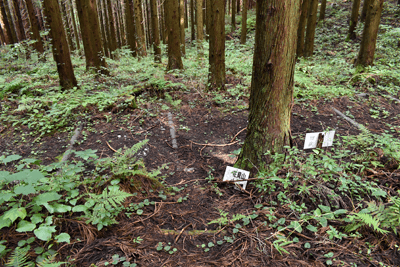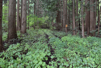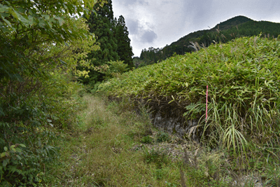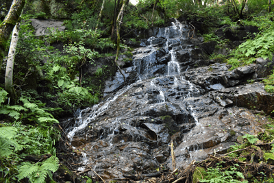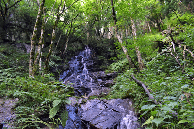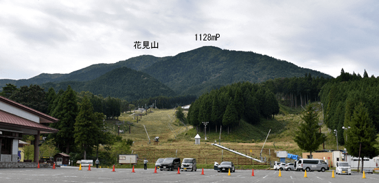 | 花見山は新見市の北西端近くにある鳥取県との県境尾根上の一山であり、「岡山の山100選」にも「分県登山ガイド岡山県の山」にも載っており、どちらの本でも周回コースが紹介されている。スタート地点は「新見千屋温泉いぶきの里」の駐車場。10時に着くと、この日はイベントがあるようで、交通整理員が準備を始めていた。駐車している車は僅かで、駐車には問題無かった。往路は北回りコースを歩こうと、始めに車道を北へと歩いた。空は曇っており、昼から晴れの予想だった。広い道を歩くと釣り堀の前を通ったので、念のためにGPSで現在地を確認すると登山コースでは無かった。登山コースは近くの別の道で、一見行き止まりになりそうな草ヤブ道だった。車一台分の細道はすっかり草ヤブになっている所もあり、登山コースとは思えぬ荒れ方だった。それも歩くうちにヤブの感じは無くなってきた。小さな沢を横切ると土道となり登山道らしくなった。やがて周囲は植林地に変わってきた。そして県境へと上り坂になった。漸く登山の雰囲気となり、つづら折れの道を登って県境尾根に着いた。そこは「いぶき峠」で、花見山の方向が示されていた。尾根道ははっきりとしており、そのまま尾根筋を南に歩けば花見山だった。笹が茂ってヤブっぽくなっている所もあったが、周囲は自然林でその雰囲気は悪くなかった。その県境尾根が途中から急坂が続くようになり、しっかりと登ることになった。気温が高くなかったためバテ気味にならずに登れたが、地図を見ると急坂は250mほど続くようだった。急坂が終わったときはほっとする思いだった。尾根が緩んで1128mピークに着くと、そこは「いぶきの里」からの南回りコースが合流する位置だった。その頃にはときおり陽射しを受けるまでに天気は良くなっていた。そして合流点から15分で山頂に到着した。狭い山頂ながらその中央に東屋がどんとばかりに建っていた。その東屋のそばに一等三角点(点名・花見山)を見た。山頂に人影は無く、東屋に入って昼休憩とした。上空はもう晴れと呼べそうな空になっており、気温は19℃と十分に涼しかった。山頂は展望があり、南の方向が広く眺められた。北の方向は木々が多くあって見える範囲は狭かったが、そこに目立っていたのは大山だった。その山頂こそ雲に隠されていたがそれでも迫力ある姿で眺められた。まずはのんびりと山頂で過ごした。下山は歩いてきた道を戻った。1188mピークに戻ってくると、予定通り周回で歩こうと南回りコースに入った。こちらはいきなりの急斜面下りだった。植林地の急斜面は前日の雨で滑り易くなっており、慎重に下る必要があった。200mほど下って漸く斜面が緩やかになると、程なく遊歩道に合流した。その遊歩道は谷滝まで通じており、滝までの距離は300mだったので、寄り道することにした。足は十分に疲れていたが、緩やかな遊歩道だったのでゆっくり歩けば問題無かった。概ね緩やかな登りで滝のそばに着いた。細流と呼べそうなソーメン滝の姿ながら優美さはあった。ただ前日に雨が降ったにしては水量は少なく、雨の少ない季節では水は涸れているときもあるのではと思われた。いっとき滝見物で過ごすと、遊歩道を引き返した。その遊歩道は途中から作業道となり、その作業道は荒れ道と言えそうだった。前方が開けると、そこはいぶきの里スキー場だった。スキーシーズンに備えて草刈りが行われていた。スキー場から離れるとキャンプ場へと入った。そのキャンプ場を抜ける「いぶきの里」が見えてきた。イベントが行われているようで、大勢の人がサイン会に並んでいるのを見た。「いぶきの里」に戻って分かったことは、バイク系ユーチューバー「アンチビクスク」のイベントのようだった。駐車場に戻ると、当然ながら新見千屋温泉に入ってからの帰宅となった。 (2025/10記) |
