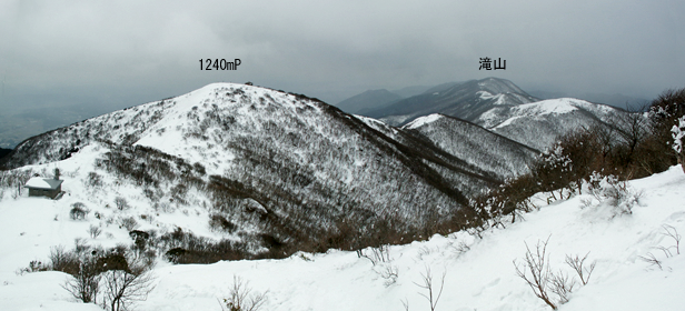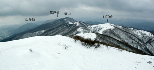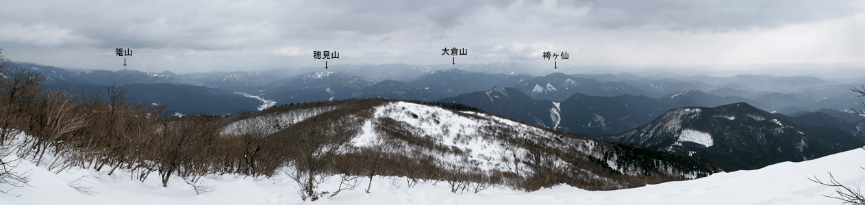 (天気) | 瀬戸内に近い所は快晴だったが、北に向かうにつれ濁ったような空となった。ときおりは陽射しを受けた。モヤの強い視界で、特に北の方向はひどくモヤに溶け込んでいた。山稜ではやや弱い風を受ける程度だったが、足下から冷え込んだ。山上の積雪は1メートルまで。多くは60〜70センチ程度だった。 | ||