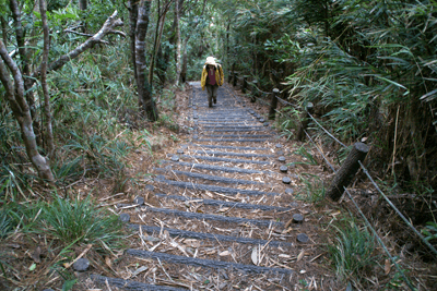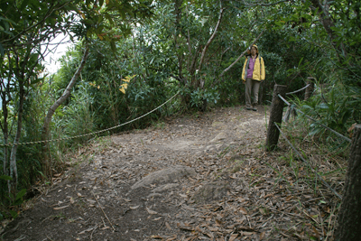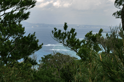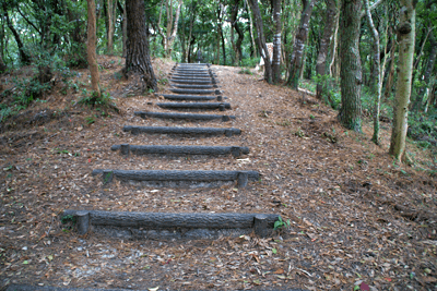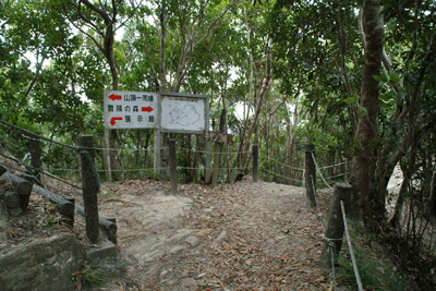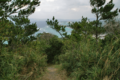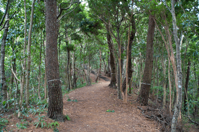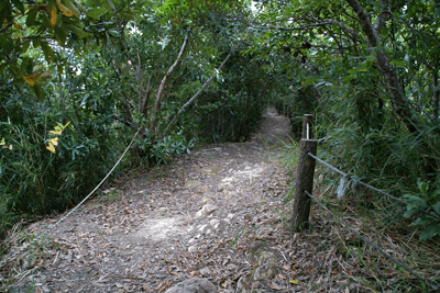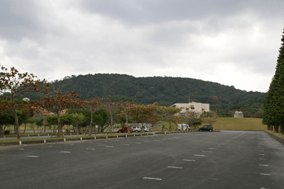 | 「新分県登山ガイド・沖縄県の山」を見ると、沖縄県と言えども島であることに変わりなく、一日たっぷりかかる山は見当たらないようで、どうも一日あれば少なくとも二つは登れそうだった。2009年の1月第二週はその沖縄へと三日行程で山行に出かけたが、メインとする山で無く、時間があれば立ち寄るつもりで考えていた山の一つが熱田岳だった。沖縄本島で登山対象となる山は縦に長い島の北半分に集中しているが、この熱田岳はその山域とは少し離れて中央寄りに位置している。具体的には国道58号線を北から南下したとき、名護市から恩納村に入ってすぐの辺りとなる。一帯は「県民の森」としてレクリエーションの場になっており、その中にあって軽いハイキングを楽しめる丘として佇んでいる。 沖縄山行の初日は9日。前日の天気予報では曇り一時雨となっていたが、予想は良い方に外れて、雲は多いながらもときおり青空も覗く天気だった。但し強風が吹いており、穏やかとは言えなかった。この日のメインは名護市街の東に立つ名護岳で、その登山を終えたのは14時過ぎだった。この日の予定では名護岳を13時には下山としていたのだが、寄り道もあって少し遅くなってしまった。この日に予定していたホテルは名護市の南外れ、恩納村に近い喜瀬にあるリゾートホテルだったが、そうなるとこの熱田岳が残りの時間ではちょうど手頃だった。ホテルの位置からだと5分ほどの距離ではと思えた。その熱田岳に向かうとなると逆に少し時間が余り気味になるので、始めに「県民の森」の中央にある総合案内棟に立ち寄った。そこまで走って来ての感想は、「県民の森」はスポーツ広場やキャンプ場があって野外活動の場としてすっかり整備されているということだった。駐車地点は少し戻って、A,Bコースの登山口が近い森林学習展示館の駐車場とする。強風の吹き荒れる天気のためか、辺りに人影は見なかった。歩き出して車道を渡った所にBコース登山口があった。そこより登り出すと、コースは遊歩道として良く整備されていた。道は良かったが、森は薄暗かった。昼頃には青空がときおり広がっていたのだが、その頃にはほぼ曇天の空に変わっていた。更に冷たさのある風が吹いており、沖縄とは思えぬ寒さを感じた。森は学習の場になっているようで、多くの木に名前の札が付けられていた。周囲の木立を見ていると松の木が多いようだったが、葉が細長く本州ではあまり見かけない種類だと思っていると、「リュウキュウマツ」の名札が付けられていた。熱田岳は最高点でも160mの高さしかないので、簡単すぎて物足りないのではと思っていたのだが、山頂が近づいたときに急坂も現れて、登山としての面白さも少しはあった。それでもごく小さな山なので、登山口から15分ほどで尾根に着いた。そこで尾根コースと合流し、ほんのひと登りで山頂だった。山頂と言っても三角点も山名標識も無く、また山頂として展望も開けていないので、単に一番高い所と言う感じしか無く、そのまま遊歩道歩きを続けてしまいそうになった。それでも最高点に敬意を表して足を止めることにした。その山頂で一段と強く風を受けることになった。気温は15℃ながらそれ以下ではと思える冷たさだった。ただせっかくの山頂なので、少しは展望を得ようと周囲を眺めると、北の方向の木立が少し空いていた。そこで風の冷たさを我慢しながら手頃な木に登ると、ブセナ海中公園辺りの風景とその東に広がる低山群が眺められた。ただ木に登ってこその眺めで、遊歩道に降り立つと尾根道の両側を木立が囲んでいる風景だった。山頂には10分とおらずに遊歩道歩きを進めた。尾根なりに遊歩道は続いており、北東方向に下り出した。その下り出したときに、ちょっと展望が現れた。北の方向で、青い海とその先には本部半島がうっすらと見えている。海岸に近い海の色はエメラルドグリーンで、その美しい色合いを見ているとここは沖縄だと実感させられた。のんびりと眺めていたかったが、ただそこも風が強く少し足を止めていただけで下山を続けた。登山道は遊歩道として最後まで続いて、ごく簡単な感じで車道に合流した。ただそこは駐車場の位置からは少し離れているようだった。後はすっかり薄暗い空の下、緩い坂で続く車道沿いの遊歩道を戻って行った。1時間とかからぬミニハイキングで終わったが、歩き易い遊歩道で気楽に山上に立て、そして青い海も眺められて、熱田岳に好印象を持って終わることが出来た。 (2009/2記)(2021/10改訂)(2025/10写真改訂) |