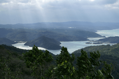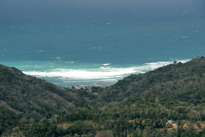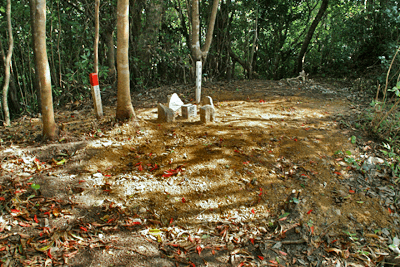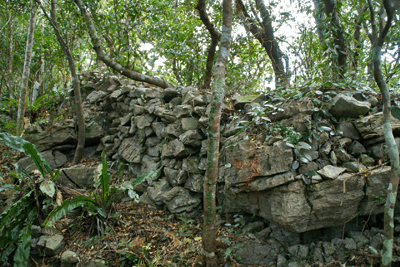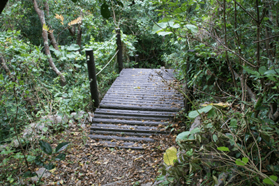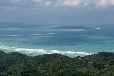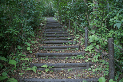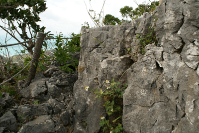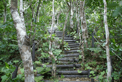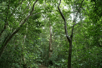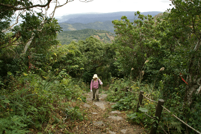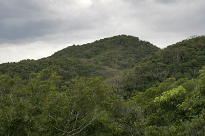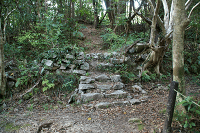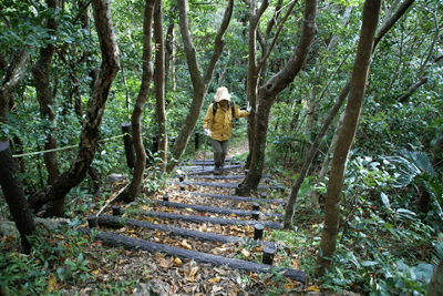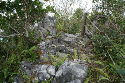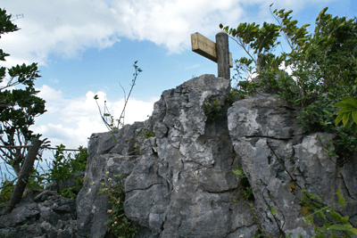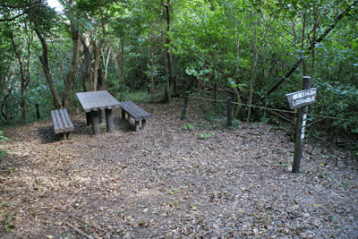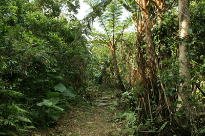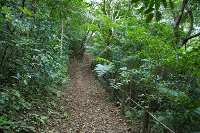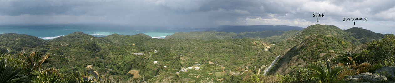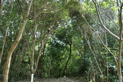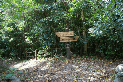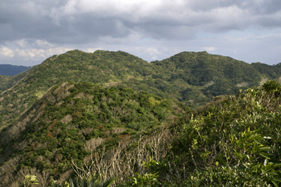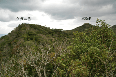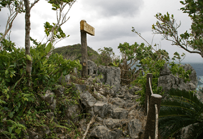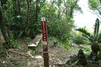 | 2009年1月の沖縄山行の二日目は、沖縄本島北部に広がるヤンバルの森を目指した。参考にしたガイドブックは新・分県登山ガイドの「沖縄県の山」で、ヤンバルの森の南部の山として、玉辻山、塩屋富士などが紹介されていた。そこでまず午前は東海岸に近い山として、玉辻山を登った。そして午後に向かったのが西海岸に近い山として、塩屋富士からクガニ岳と続く尾根だった。福上湖に近い玉辻山の登山口を離れたのは、12時前だった。国道331号線を走り、塩屋で国道58号線に入って北上する。ガイドブックでは創造の森に登山口があるとなっており、それを目指して道の駅「おおぎみ」の手前から林道のような道に入ると、車道は急坂で続いた。すんなりと上原公民館が現れたので、創造の森への道に入って行けるものと思っていると、なぜかやたらと枝道があり、どれが正しい道なのか迷ってしまった。おまけに標識も見えなかった。この道ではと思って進むとどうも違うようであり、そこで引き返して別の枝道に入ったりしたが、それも違うようで、うろうろするうちにクガニ岳の登山口標識が現れた。ガイドブックに無いコースだが、それで尾根出られるものならと歩き出すと、なぜか道は不確かになってしまった。結局、車に戻って再びうろつくことになった。けっこううろうろしたようでも、時間にすれば20分ほど経った頃だろうか、どう走ったか分からぬままに展望台の前に出た。そばには登山コースの案内板が立っており、近くには駐車場も見えていた。ガイドブックと照らし合わせて、どうやらクガニ岳とネクマチヂ岳の間を通る林道上に立っているようだった。最初の考えではガイドブック通りに創造の森の登山口から歩き始めて、始めに塩屋富士を登り、その後はクガニ岳へと歩いて更にネクマチヂ岳まで行き、そこから引き返す考えだったが、予定を変更してここからスタートすることにした。コースとしてはまずクガニ岳に立ち、そのまま尾根を進んで塩屋富士に向かう。塩屋富士からはコースを引き返してきて、今立つ位置に戻ってくる。それから改めてネクマチヂ岳をピストンするという考えだった。 この日は雲が空を覆っており、強い西風が吹いていた。瞬間的には台風並の風になることもあった。ただ雲は薄いようで、風に引きちぎられて青空の覗くこともあった。車は駐車場に止めて、展望台のそばから始まる登山道を登り出した。その登山道は丸太の階段道として整備されており、すっかり遊歩道の雰囲気だった。風の強さと10℃しかない低い気温を我慢すれば、まずは簡単なハイキングだった。周囲の木立はすぐに鬱蒼とした雰囲気になった。ここもやはりヤンバルの森の一角と呼べそうだった。小さなピークを越して鞍部に下り、登り返すと坊主森とクガニ岳の分岐点に出た。坊主森はごく近い位置にあるピークのようだったが、帰路に立ち寄ることにして、まずは尾根を西へと、クガニ岳を目指して行く。尾根の道も変わらず遊歩道状の歩き易い道で、小さなアップダウンを繰り返していた。周囲は樹林が取り囲むとあってすっかり森の中を歩いている雰囲気で、風はあまり受けなかった。少し登り坂があって「ぶながや広場」との分岐点を過ぎると、クガニ岳への登りとなった。そこでまた強く風を受けるようになった。そして尾根はちょっとした岩場に変わってきた。岩は花崗岩質で鋭く角が立っており、また穴が多く開いて独特の質感を持っていた。滑り易さとは正反対で、靴底が岩にひっかかり過ぎる感じがあり、うっかりするとつまづきそうになった。クガニ岳の山頂が間近になったとき、足下をおろそかにしたためか、一度つまずいてしまった。幸い杭につかまって膝を打っただけだったが、転び方によっては、軽い怪我では済みそうに無かった。クガニ岳山頂に着くと、そこは好展望地で、西には広々と東シナ海の風景が広がっていた。それにしても風が強く、立っているのがやっとの感じで、落ち着いて風景を楽しむ訳にはいかなかった。長居は諦めて先に進む。鞍部へと下り、そして緩やかな登り坂となったが、なぜか塩屋富士の名が現れなかった。クガニ岳に着くまでは、クガニ岳の名の書かれた標識を何度も見ていたのだが、そのクガニ岳を過ぎた先で見る標識は、塩屋富士の先にある六田原(むたばる)の名のみだった。塩屋富士の名が無いことは気になったが、方向は間違っていないはずなので、尾根歩きを続けて行く。その尾根にときおり小さな実が落ちているのが見られるようになった。所によっては何個もまとまって落ちていた。ミカンの姿の黄色い小粒の実で、どうやらそれがシークワァサーかと思えた。見上げると、その黄色い実をつけた木があちらこちらに見えていた。またその辺りでは登山道と平行して石垣が続いていた。自然石を積み上げたもので、この山中によく作ったものだと、ちょっと感心させられた。尾根の途中には展望地も見られたが、ま
