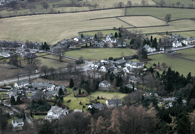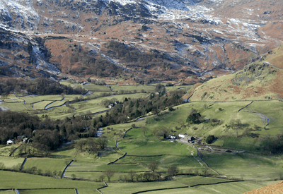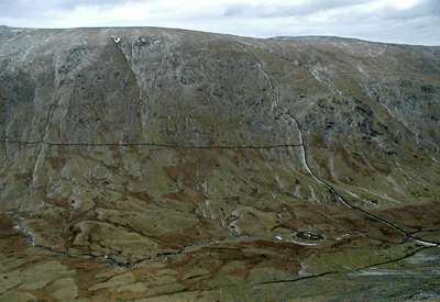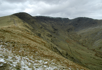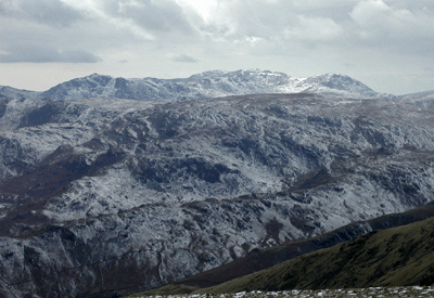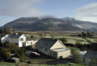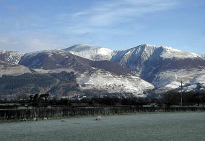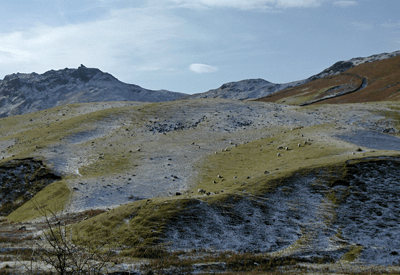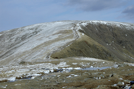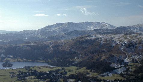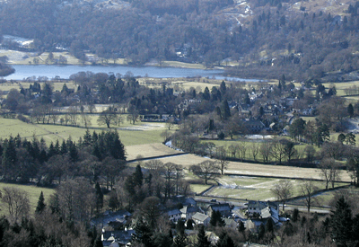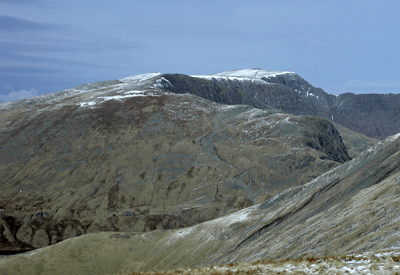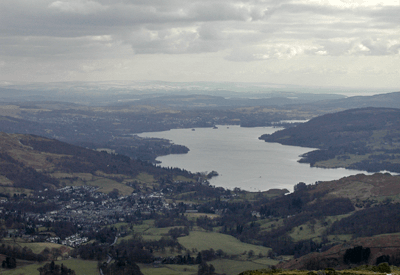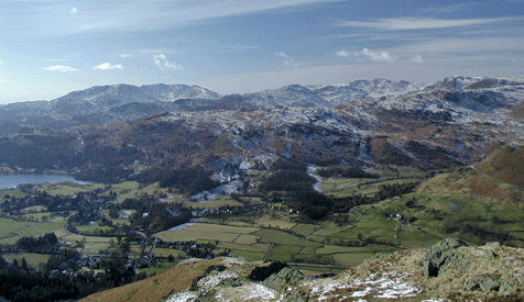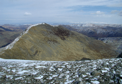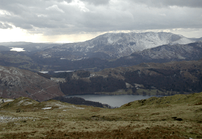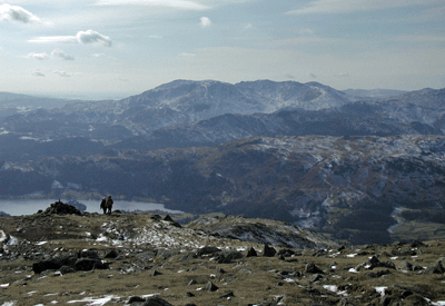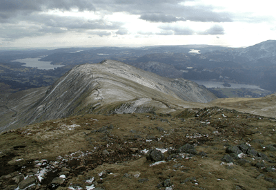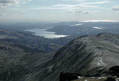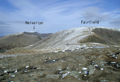 Pike)に向かう予定をしていたのだが、西から天気が悪化する予報を聞いて、無難な東地域の中でも登り易そうな山としてフェアフィールド山(Fairfield)を急きょ選んだ。 前夜の宿泊地Thornthwaite村を離れてケズウィックへとまずは向かった。ケズウィックの市街を通り抜け、A591を南下する。予想に反して快晴の空が広がっていた。グラスミアの町に入り、町中の駐車場に駐車とした。地図を見ながら登山口を求めて歩いて行くと、町外れの登山口までは駐車場から30分ほど歩くことになった。登山口の柵を越えてフットパスに入った。少し傾斜が強いフットパスを登って行くと、登るほどに足下にグラスミアの町並みが広がってきた。そして西向かいの山並みが広く眺められるようになった。西の空は少し薄曇りになり出していたが、上空は青空が広がっており、周囲の風景も鮮やかに見えていた。登るほどに前日に降ったと思われる雪が尾根に多く見られるようになった。但し、うっすらと積もっている程度だった。[Stone Arthur]と呼ばれる岩場を過ぎると尾根は緩やかになり、ハイキングと言うよりもウォーキングの感覚で登って行けた。ただ登るほどに風は冷たさを増し、強く吹いて来た。尾根には牧草が生えているだけで木は全く見られず、強風をまともに受けることになった。山頂の一つ手前のピークとなる[Grate Rigg]で南からの尾根と合流した。そちらの尾根から登る人が多いようで、ここに来て十人以上の人を見かけた。その頃には上空に薄雲が広がり出しており、一段と寒さがつのってきた。尾根上の水たまりはすっかり凍っており、それを踏まないように心がけながら登った。そして登山口から2時間ほどでフェアフィールド山の山頂に着いた。そこはなだらかになっており、北には二日前に登ったヘルヴェリン山(Helverllyn)が大きく見えていた。その山頂部は真っ白になっていた。ヘルヴェリン山は、見る角度によって異なった姿を見せる山だが、このフェアフィールド山からは、鋭角的な姿を見せていた。この展望を始めとして山頂の展望は素晴らしく、360度の展望を楽しむことが出来た。東向かいの山並みとの間には深い谷が見えており、北西方向には Ullswater湖も望めた。そして西のスカフェル・パイク山の山並みもはっきり見えていた。もう上空はすっかり曇っていたがスカフェル・パイク山にはガスはかかっておらず、向かっておれば山頂に立てていたのではと思うと少し残念だった。このフェアフィールド山の山頂は一段と風が強く、寒さがいっそう険しかった。ピークのそばにあった暴風壁で風を避けながら小休止とする。下山は同じルートを辿ったが[Grate Rigg]からは登りとルートを変え、そのまま尾根を南に真っ直ぐ向かった。なおこの下りで十数人のハイカーとすれ違ったが、中には短パンの人も見かけ、イギリス人の寒さに対する強さを改めて知る思いだった。尾根は緩やかに長々と続き、なかなか高度を下げて行かない。展望は良く、尾根の行く手にはアンブルサイドの街並みに Windermere湖や Conistone Water湖、遠くは海岸線も見えていた。小さなピークを幾つか過ぎて[Heron Pike]と見られる小ピークに着いた所で尾根のフットパスを離れることにした。そしてグラスミアの町を目指して真西に急斜面を下った。地図では破線路が示されていたが、それらしき道は見えず、急斜面と言っても全くの牧草地なので適当に下って行けた。どんどん下って中腹も過ぎた頃に漸くフットパスに合流した。そのフットパスのままに歩くと、始めの登山口に行き着いた。その後はグラスミアの町を散策しながら、駐車地点へと戻って行った。 (2007/4記)(2025/9写真改訂) |
